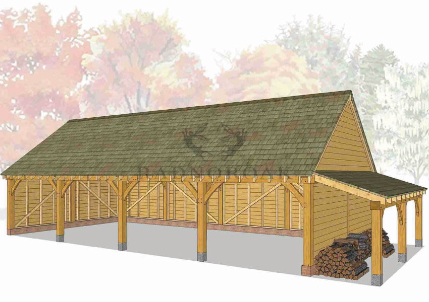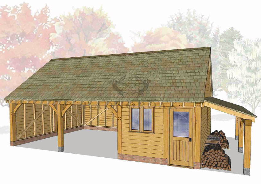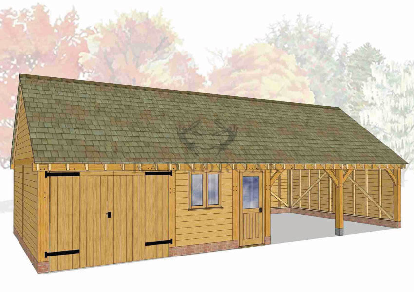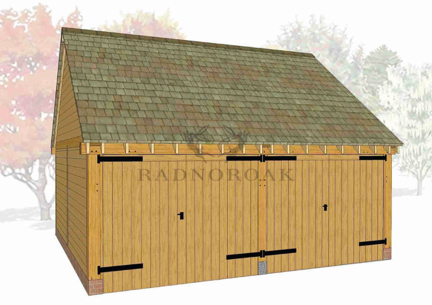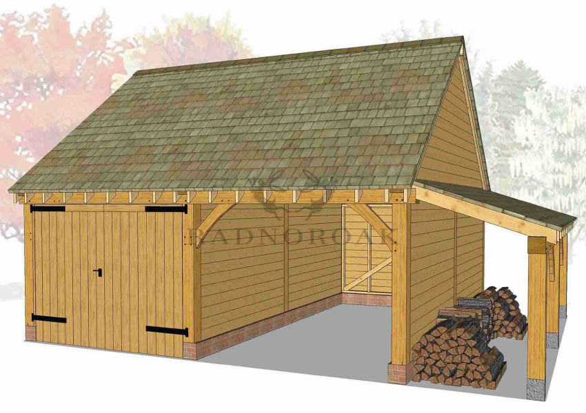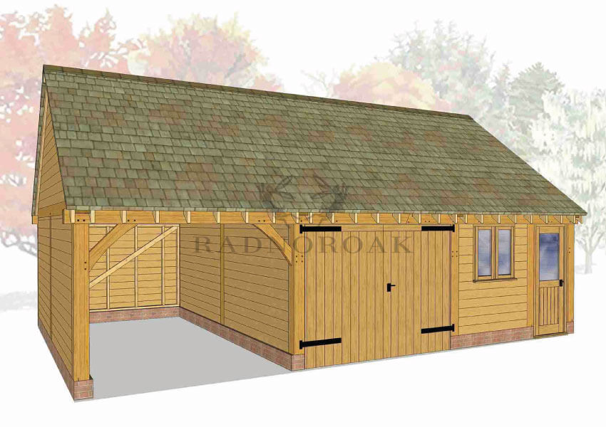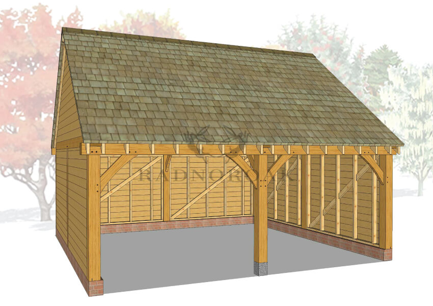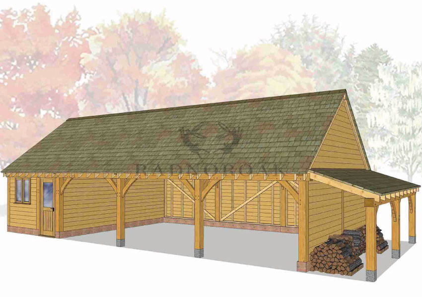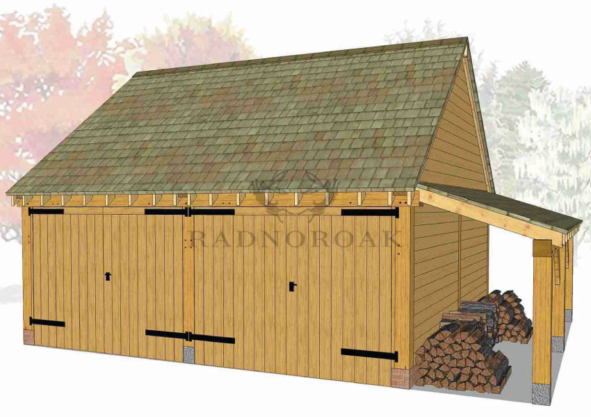 Each bay can be designed as an open-fronted carport for easy access or fully enclosed with secure oak doors and traditional joinery. Optional additions include integrated log stores, glazed windows, and rear or side access doors, making it easy to customise the structure for use as a garage, workshop, or mixed-purpose outbuilding. The steeper roof pitch also allows for added internal height, ideal for taller vehicles or future loft storage potential.