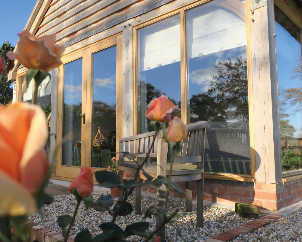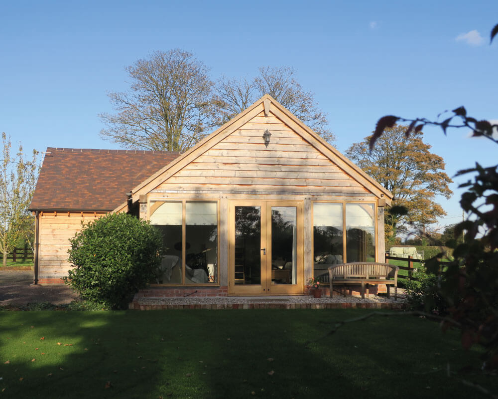 Our customer asked us to create a multi – purpose family building. A car port with storage above, a log store, a garden store, a music room, sun room and annexe all rolled into one fantastic oak framed building.