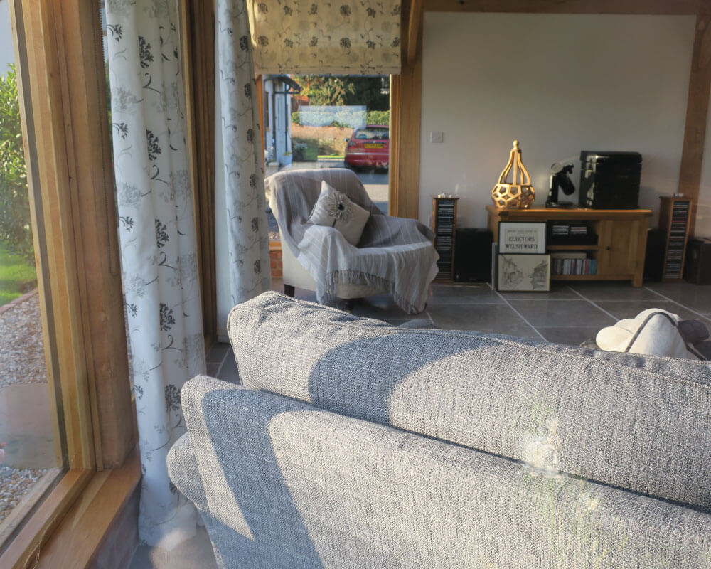 The ‘comfy’ furniture is perfect for relaxing indoors, whereas the French doors in the end of the building allow access onto the patio area, and to cool the room down in hot weather. As you’ll see, there’s plenty of room for the drum kit!!