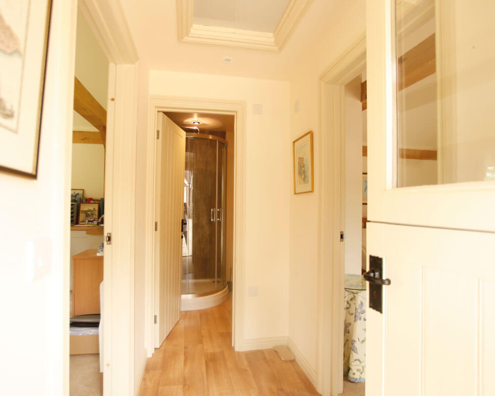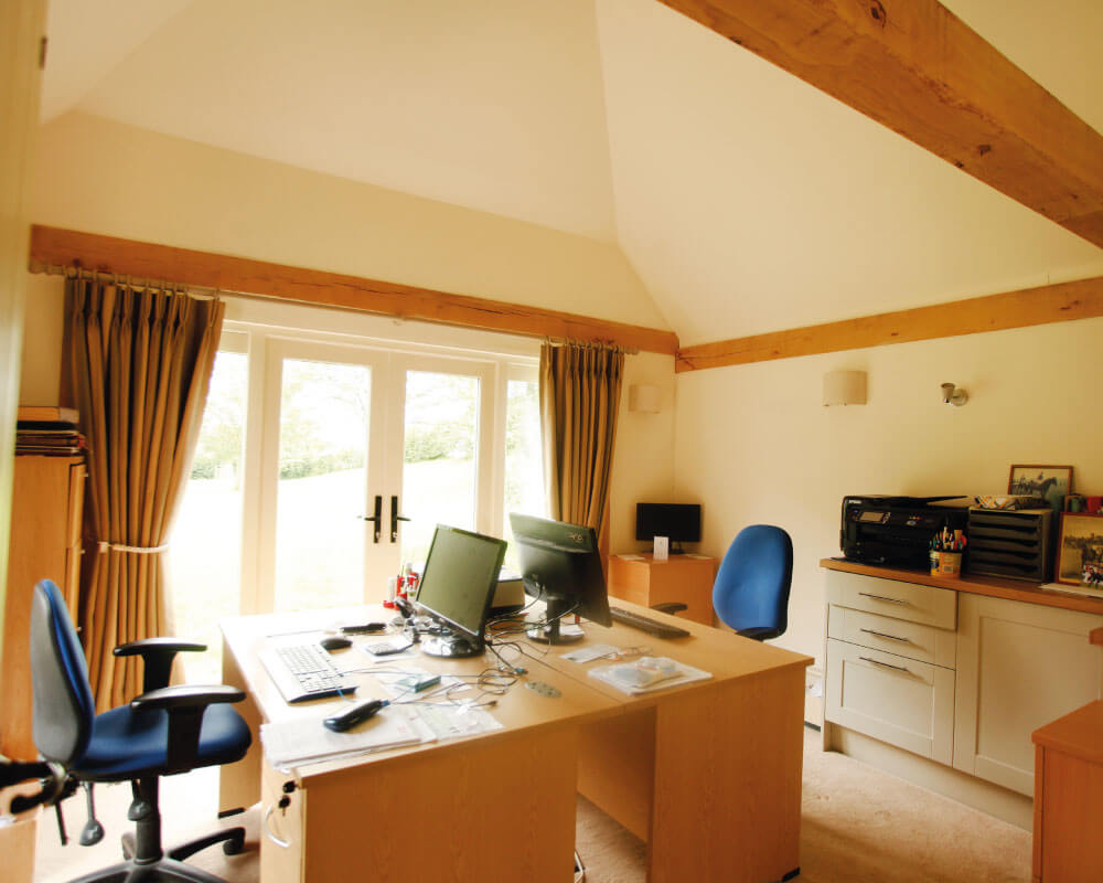 The oak frame includes exposed posts, tie beams and knee braces. Oak floorboards offer additional character to the hallway, whilst thick carpets keep the office and bedroom especially cosy. Painted oak doors and oak windows with traditional ironmongery complement the building perfectly.