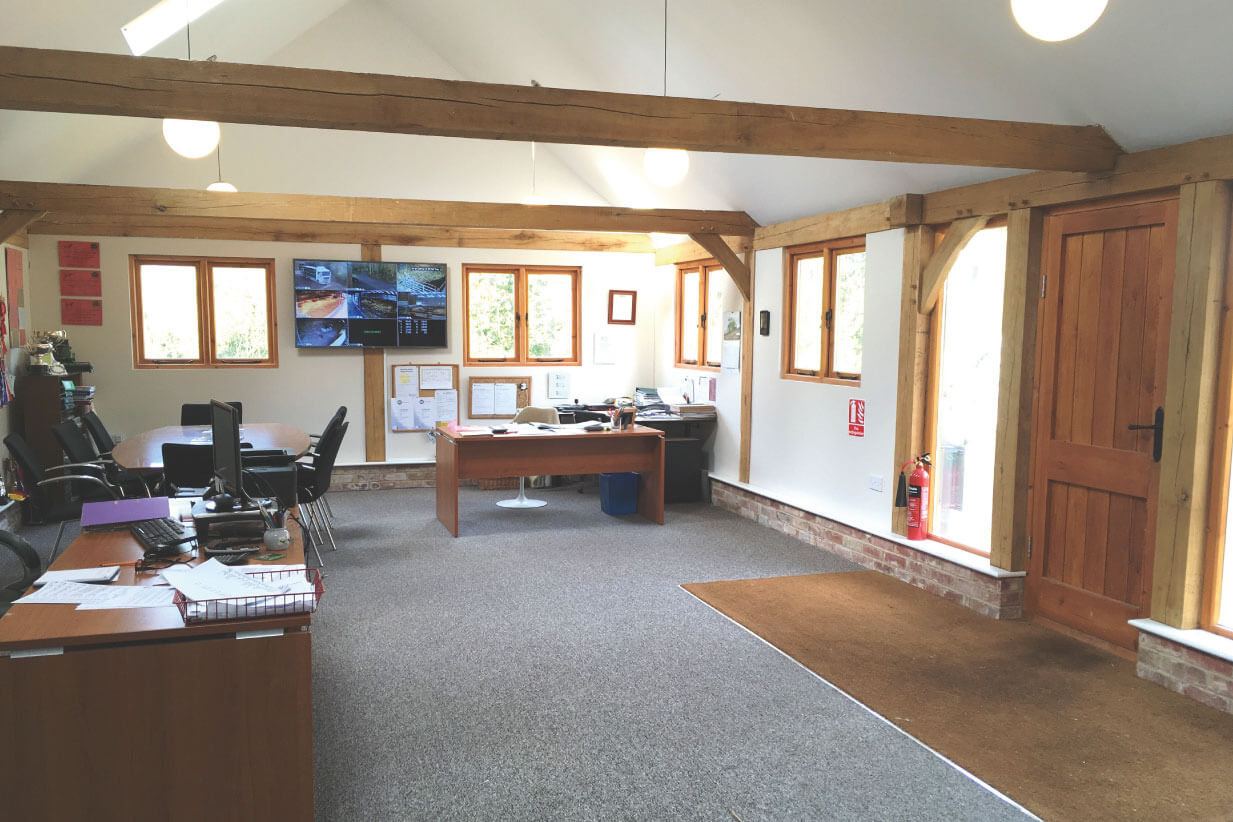 Providing a flexible and comfortable open plan work place, the exposed oak posts, beams and braces ensure that work is pleasurable! There is plenty of room for several workstations, a meeting table, a kitchen and toilet. After the project was completed, the owners even provided a tray for the cat and a mat for the dog!
