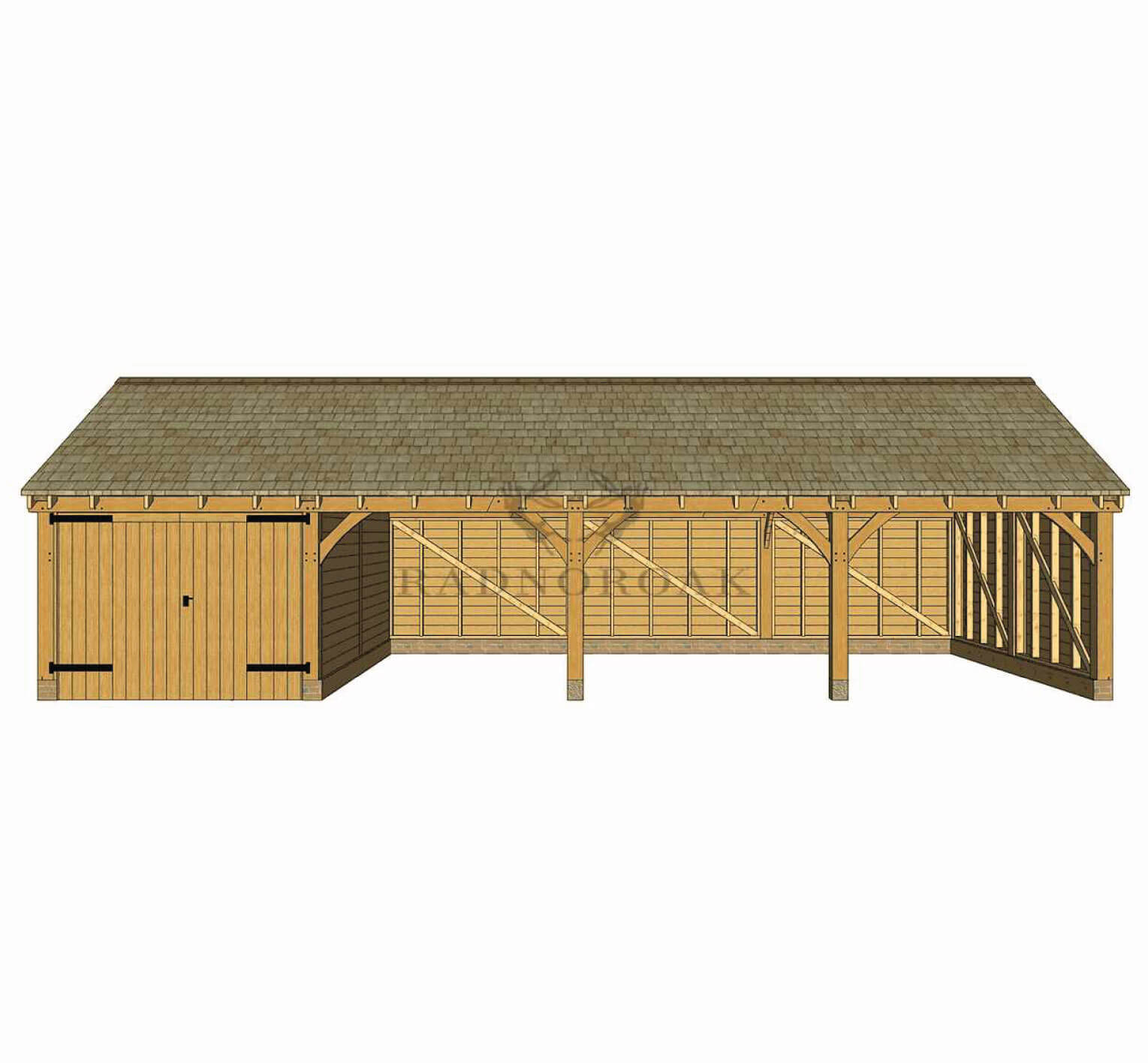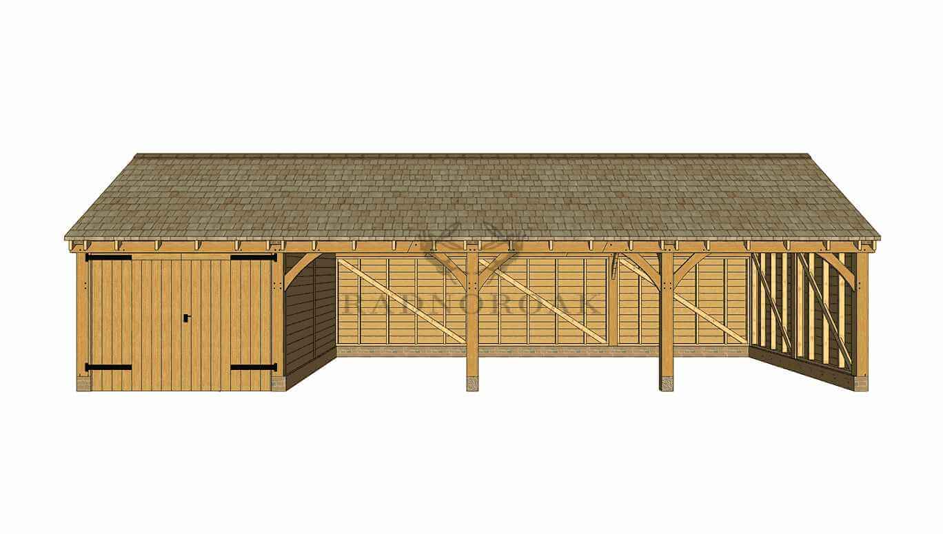 This four bay oak framed outbuilding, combines three open car port bays with a secure enclosed garage bay for flexible storage and vehicle protection.