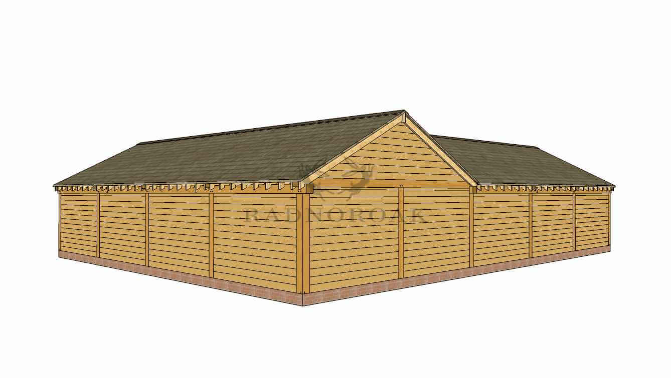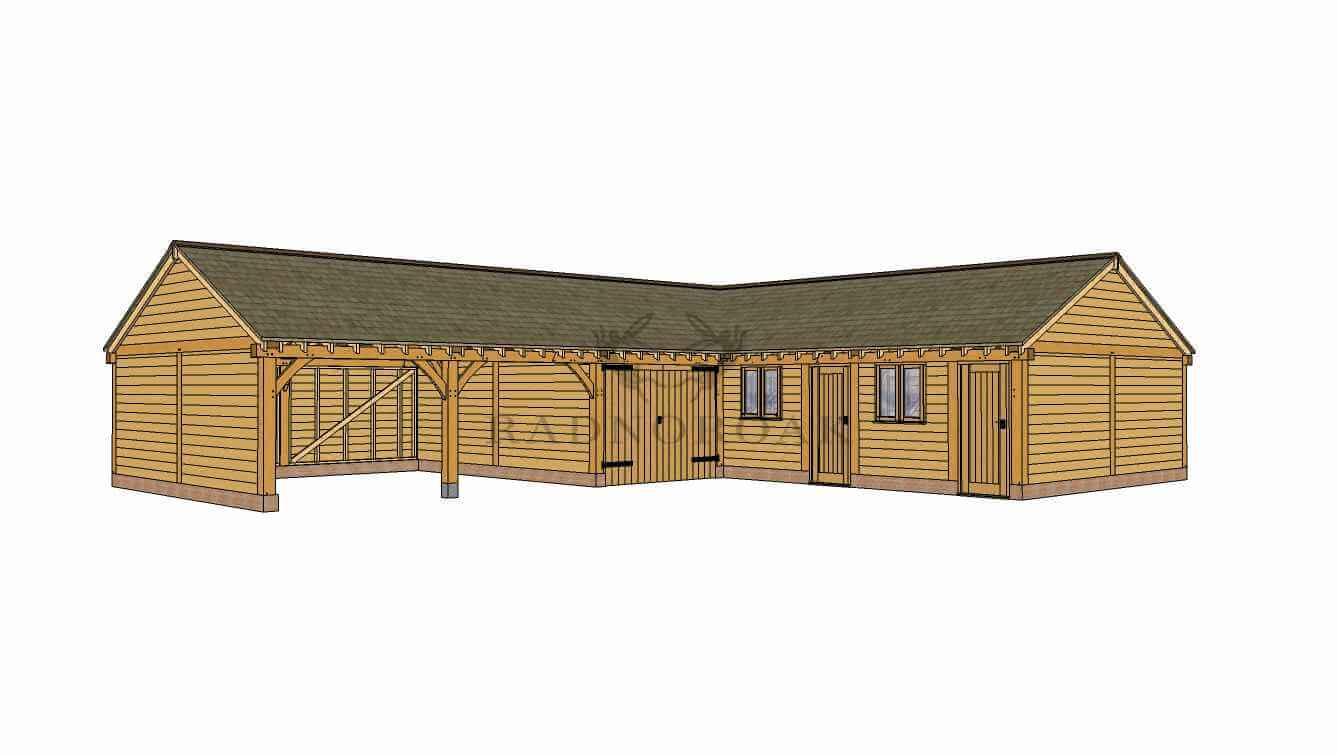 A beautifully designed L-shaped oak framed outbuilding combining secure storage, open-fronted car ports, and covered access under one expansive oak structure. With a mix of enclosed rooms and open bays, this layout is ideal for estates, farms, or countryside homes in need of robust, multi-purpose space.
