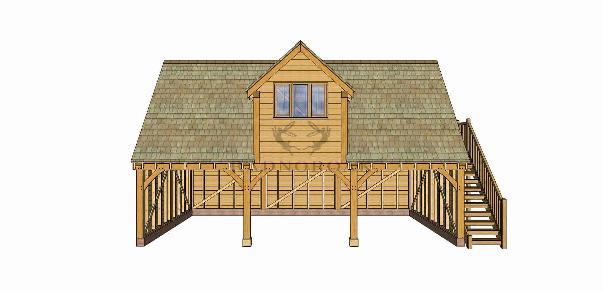 The NBWD4 is a beautifully proportioned two storey oak framed garage featuring a bay width dormer and external oak staircase - offering both secure vehicle storage and a spacious upper room filled with natural light. Ideal for guest accommodation, home offices, or hobby spaces, this layout brings flexibility and character to rural homes.