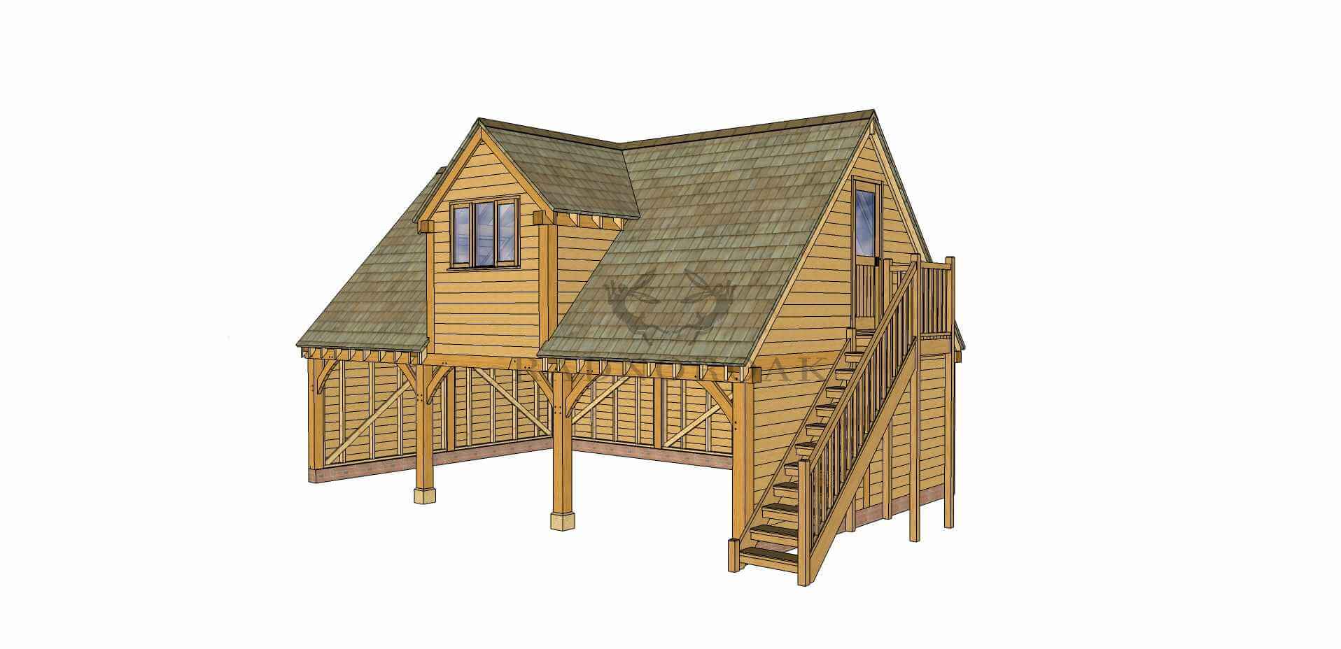 Crafted from premium oak in our Mid-Wales workshop, the structure showcases chunky oak posts, traditional mortice and tenon joints, and classic featheredge cladding. The open bays offer everyday practicality for vehicles or storage, while the external oak staircase leads to a light-filled loft, complete with dormer window for additional headroom.