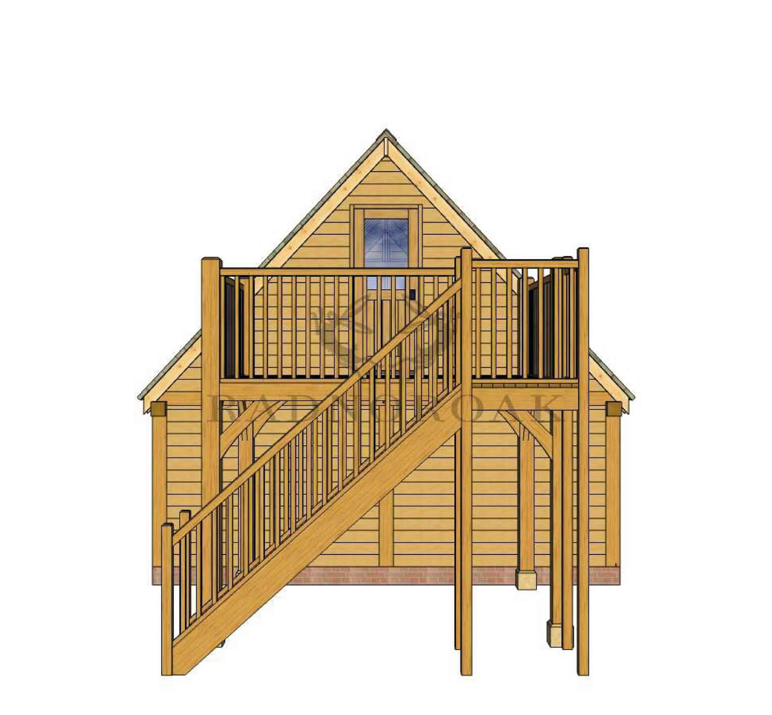 Handcrafted in our Mid-Wales workshop from premium quality oak, this external gable balcony offers generous outdoor space for relaxing, entertaining or enjoying views across the garden or countryside. Measuring 4.30m wide and traditionally jointed with mortice and tenon techniques, the design features chunky oak posts and beautiful oak balustrades. The external oak staircase provides access to the upper floor, blending seamlessly with the structure below.