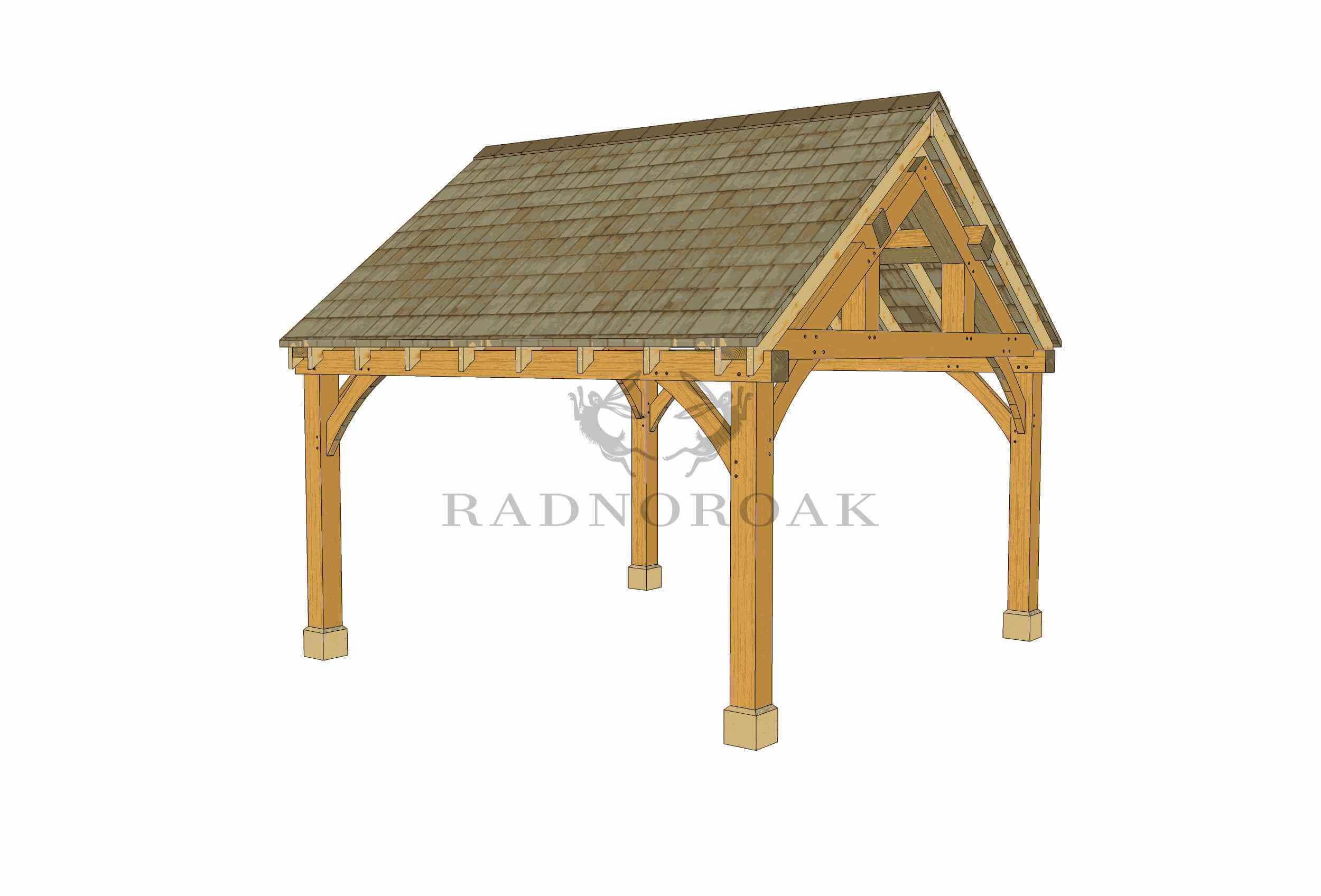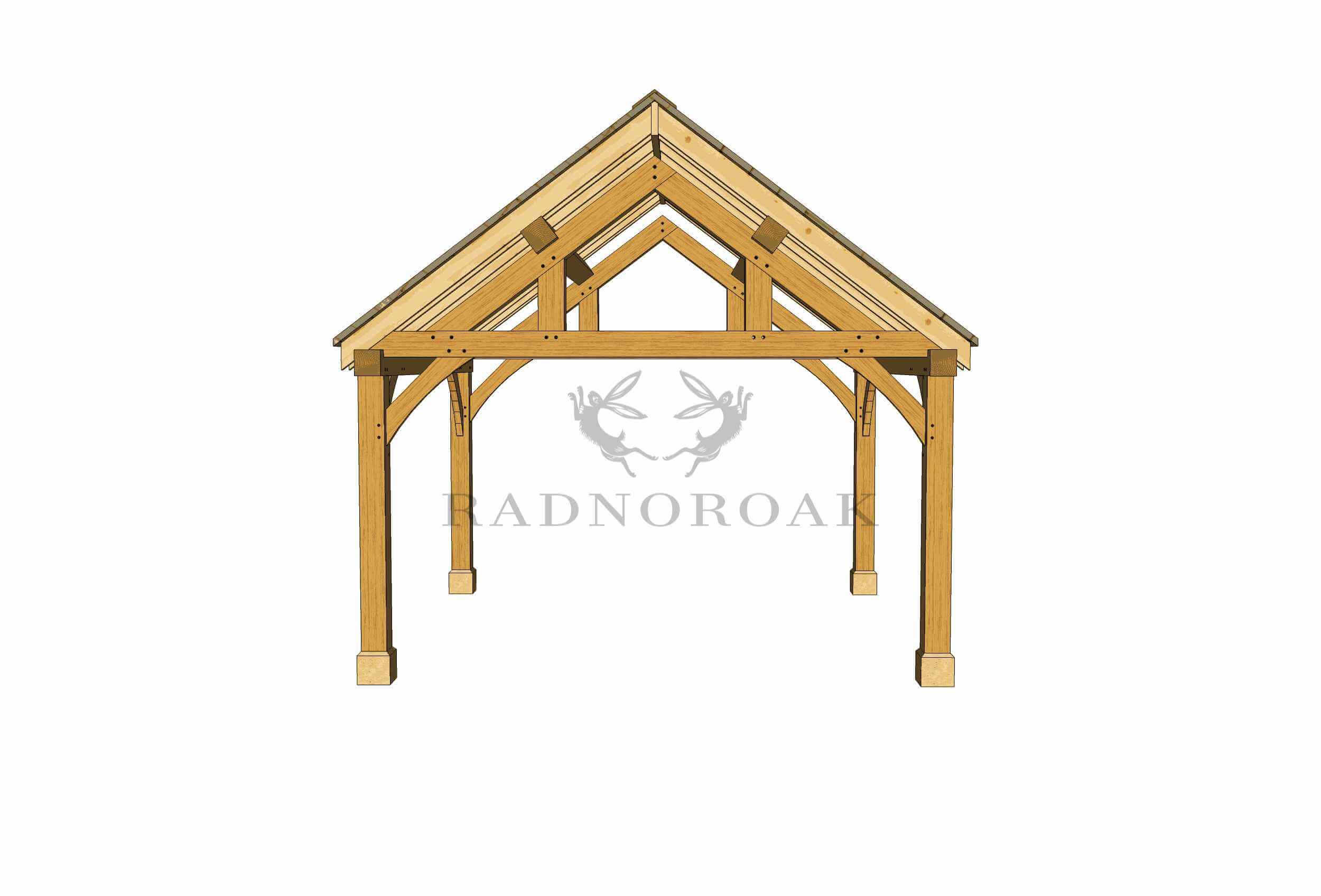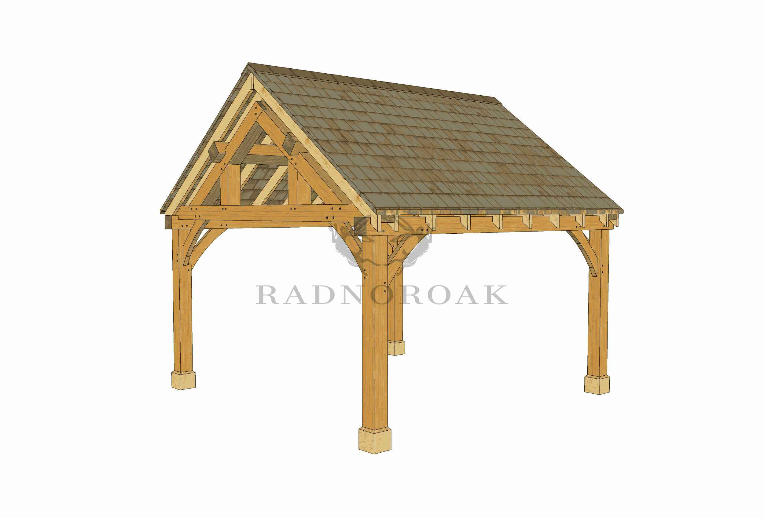 Crafted in our Mid-Wales workshop using traditional mortice and tenon joints, this pavilion features chunky oak posts, decorative oak knee braces, and handcrafted king post oak trusses. The exposed frame provides robust character, while a choice of roof coverings - including cedar shingles, natural slate, or clay tiles - allows you to tailor the finish to suit your setting.