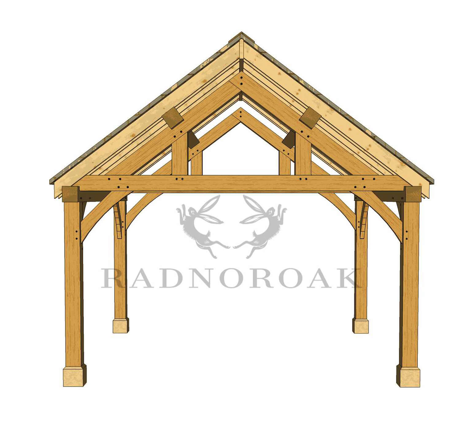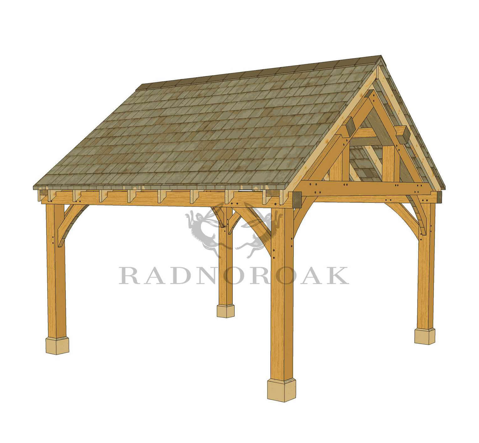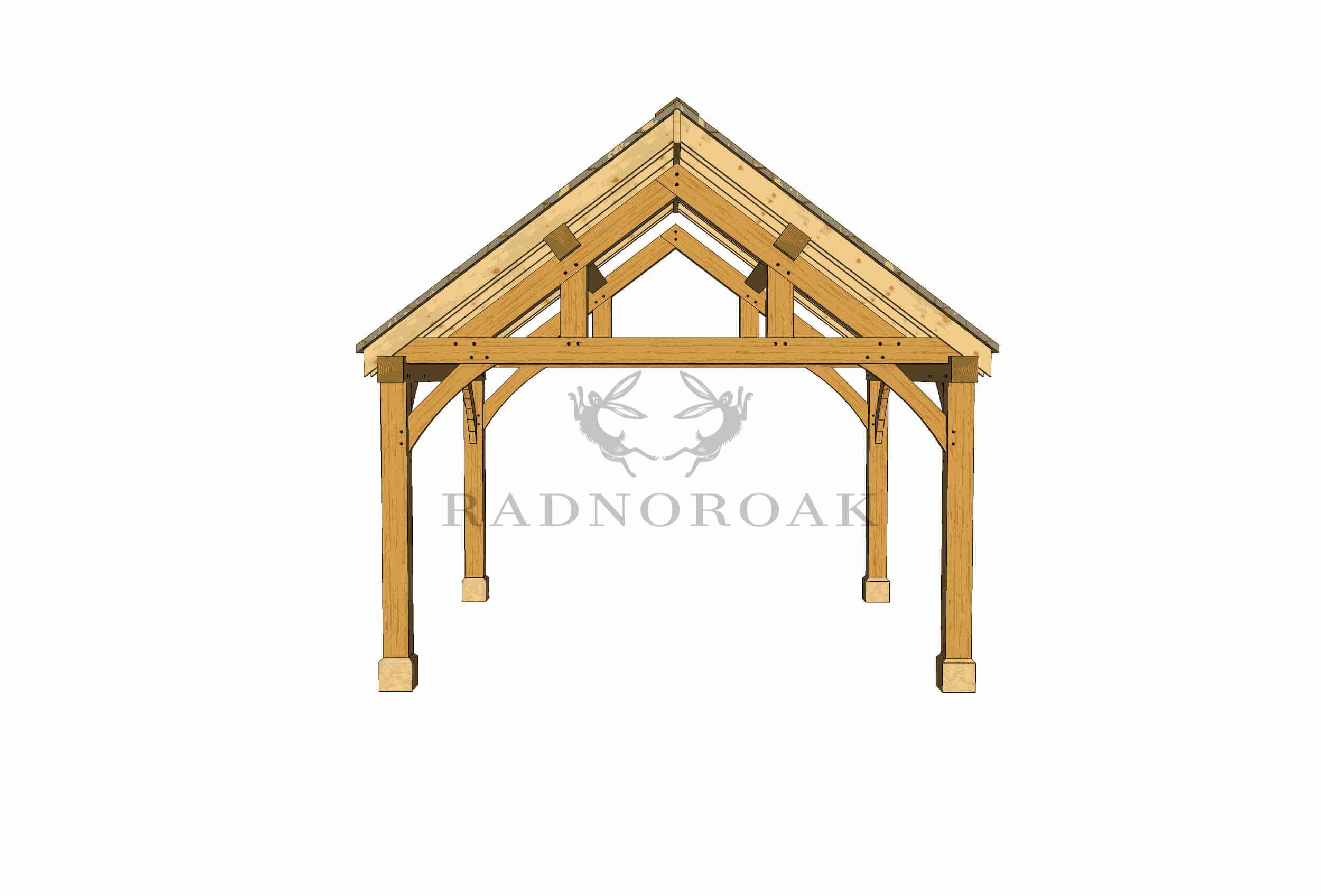 Crafted in our Mid-Wales workshop using traditional mortice and tenon joints, this pavilion features chunky oak posts, decorative oak knee braces, and handcrafted king post oak trusses. The exposed frame provides robust character, while a choice of roof coverings - including cedar shingles, natural slate, or clay tiles - allows you to tailor the finish to suit your setting.
