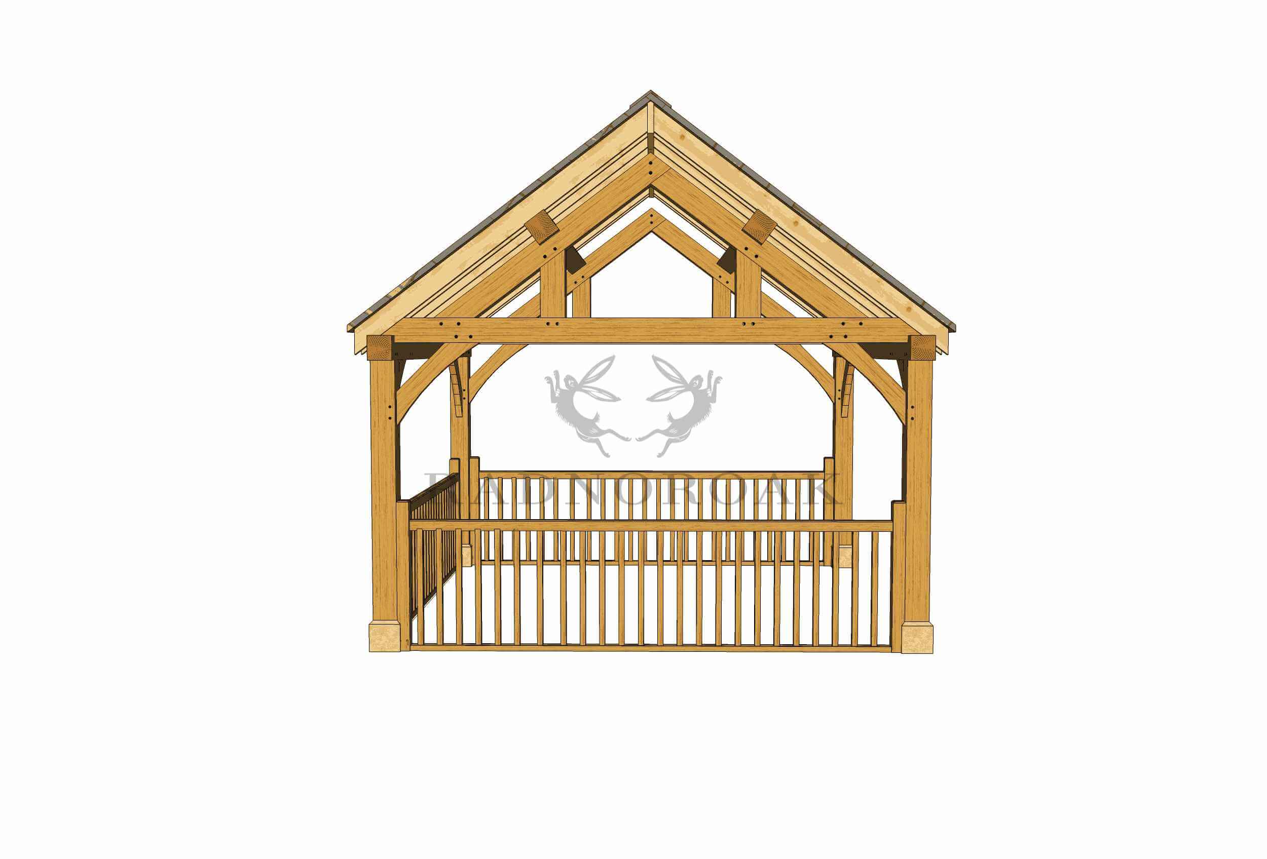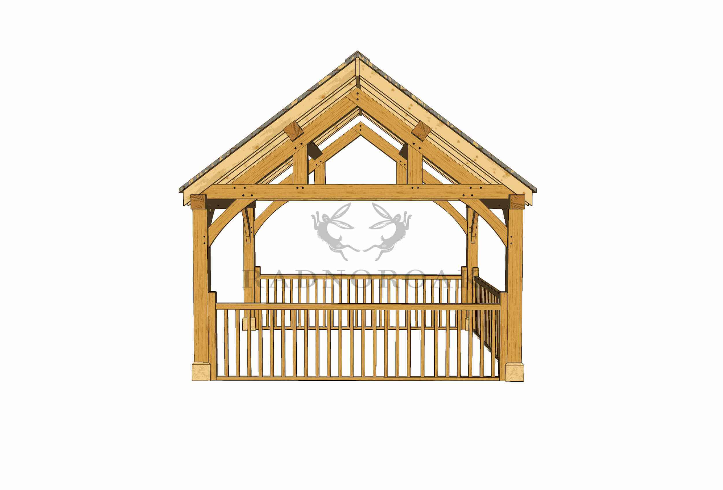 The PS005 is a compact oak framed garden pavilion, ideal for relaxed outdoor seating, sheltered dining and year-round garden enjoyment. With open gables exposing the oak trusses and oak balustrades to three sides, this garden pavilion offers a balance of enclosure and openness - perfect for the refined British garden.
