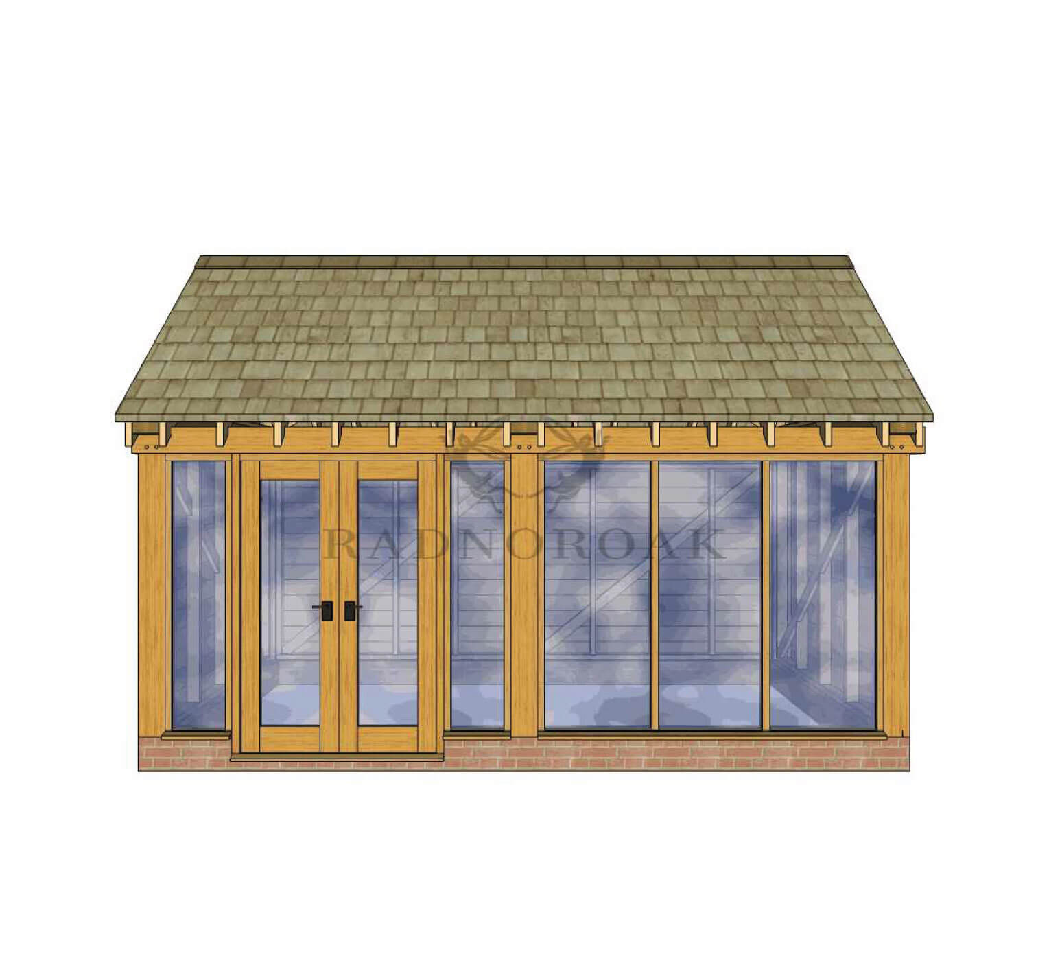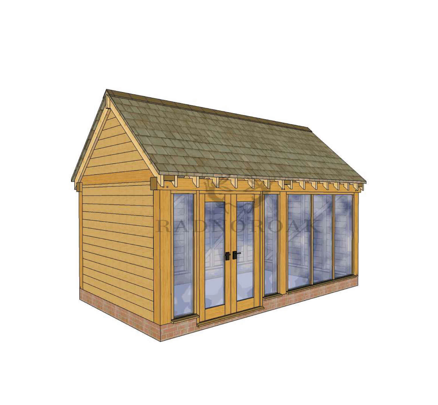 Crafted in our Mid-Wales workshop using premium oak and traditional mortice and tenon joints, this design features floor-to-ceiling glazing, double French doors, and our signature featheredge cladding to the side and rear elevations. The full-height glass panels flood the interior with natural light, making it a perfect oak garden office, summerhouse, or home studio.