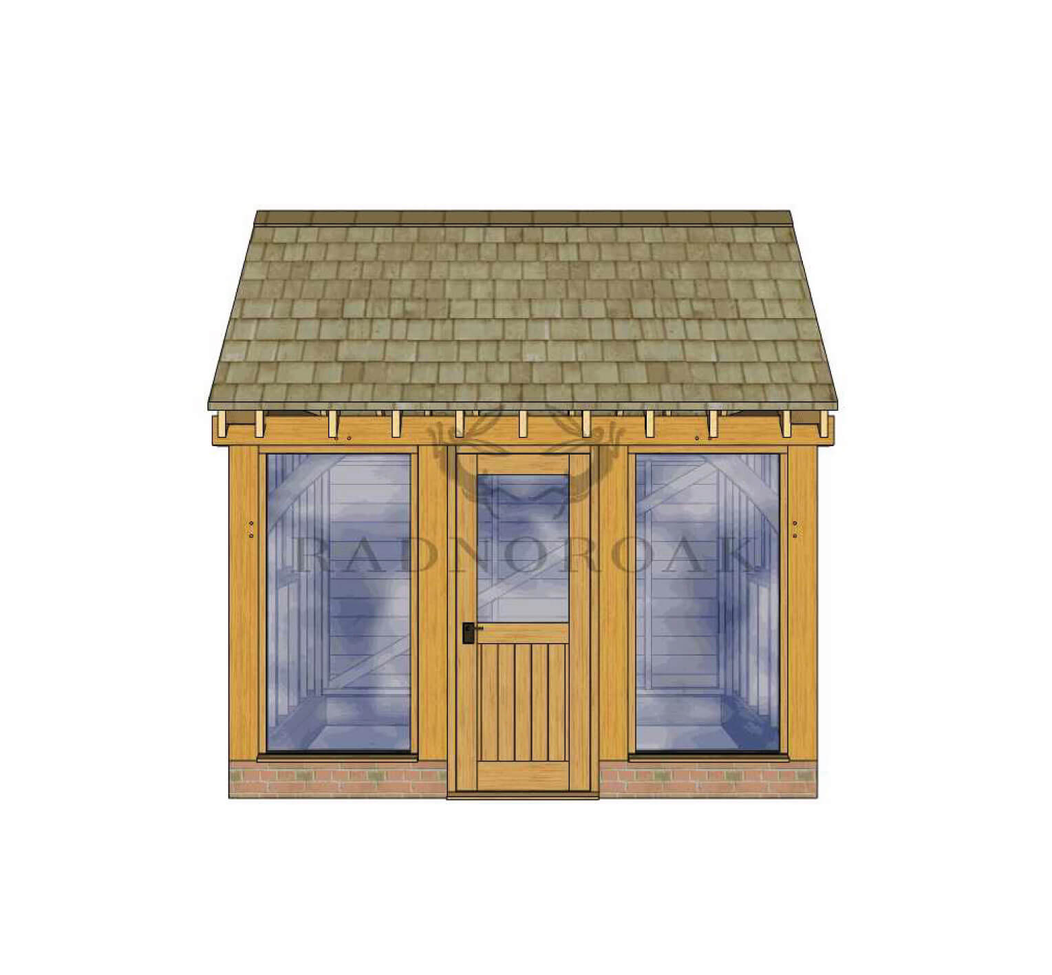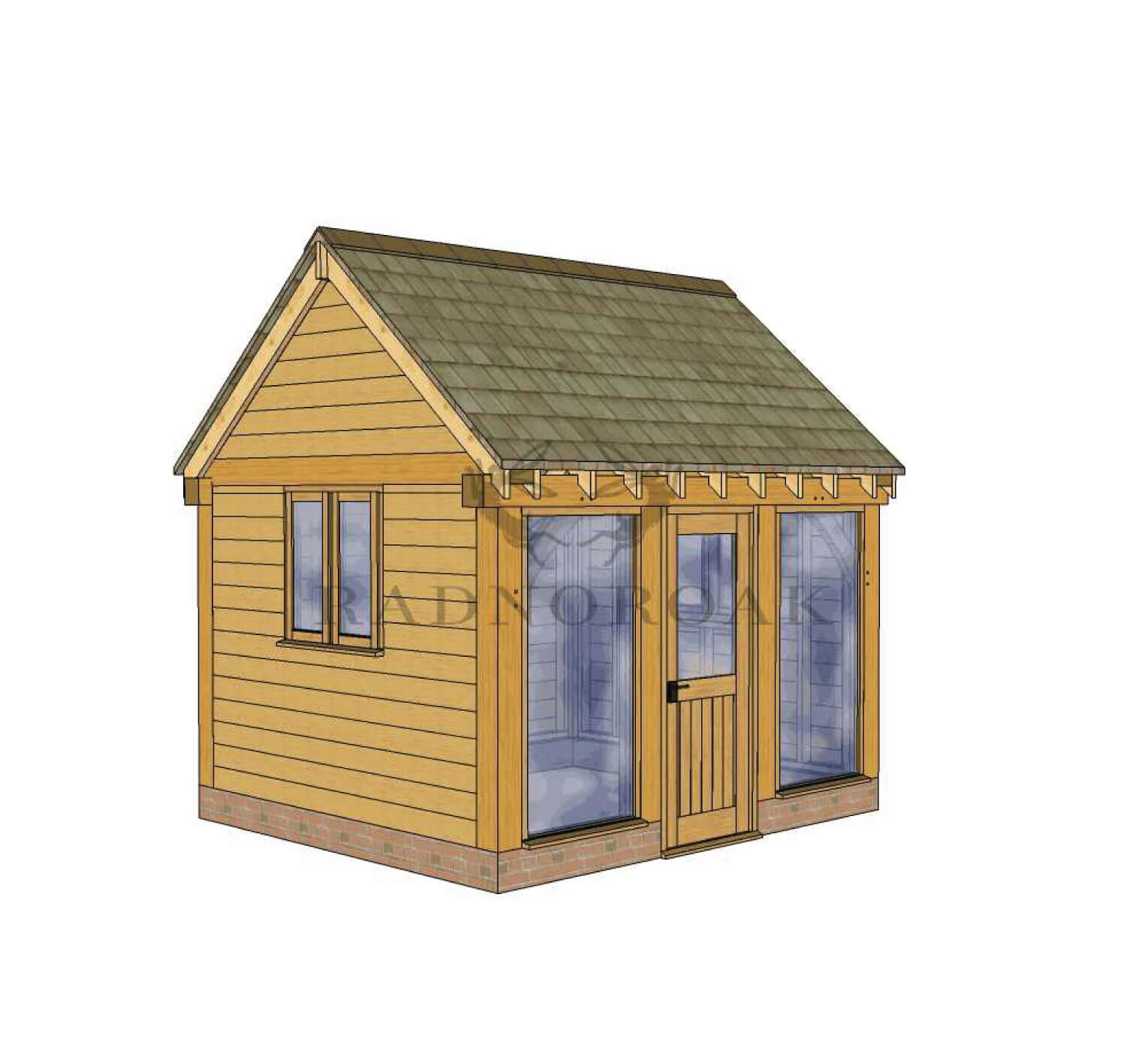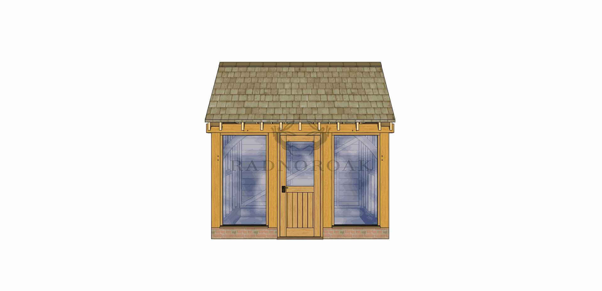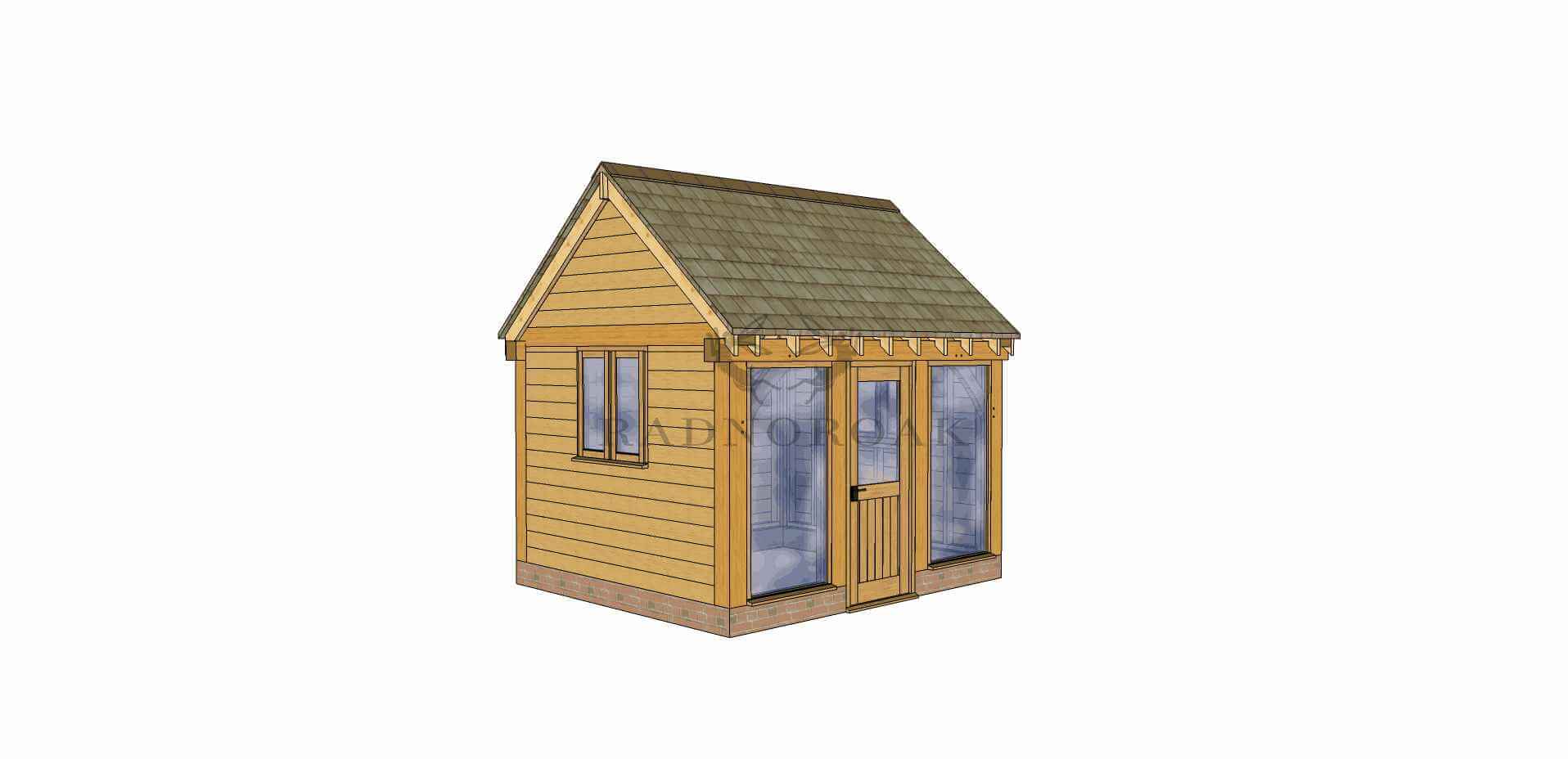 Our Oak Framed Garden Room is unmatched in design, adaptability, and price competitiveness. Keep in mind that the final height of the building depends on roofing materials and brickwork. WIDTH: 3.50m, HEIGHT: 3.50m, DEPTH: 3.00m, ROOF PITCH: 35.00°.
