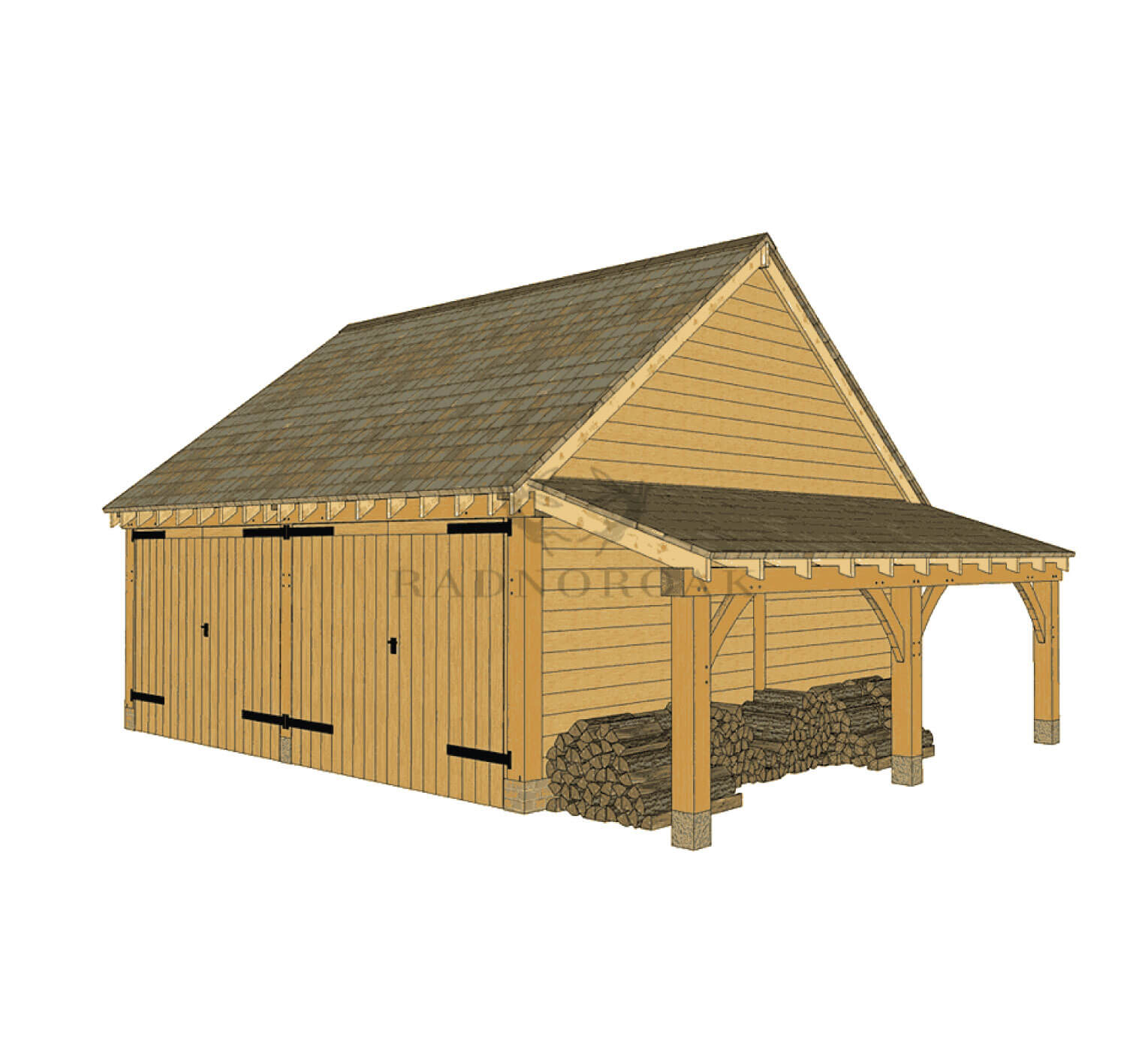 The Two Bay Oak Framed Garage with Log Store – BYH2005 combines secure enclosed parking with practical firewood storage in one versatile oak-framed building. The two enclosed bays, fitted with traditional barn-style doors, provide reliable shelter for vehicles, tools, or garden equipment. Alongside, the open-sided log store offers additional storage and can be positioned on either the left or right-hand side to suit your site layout.