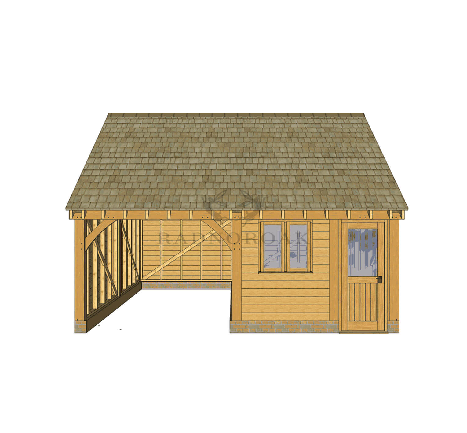 Crafted in our Mid-Wales workshop using premium oak and traditional mortice and tenon joints, the building features chunky oak posts, traditional knee braces, and premium featheredge cladding. The open-fronted bay allows for easy parking or quick-access storage, while the enclosed bay is fitted with a personnel door and glazed window for natural light, ideal for year-round use as a workspace or secure store.