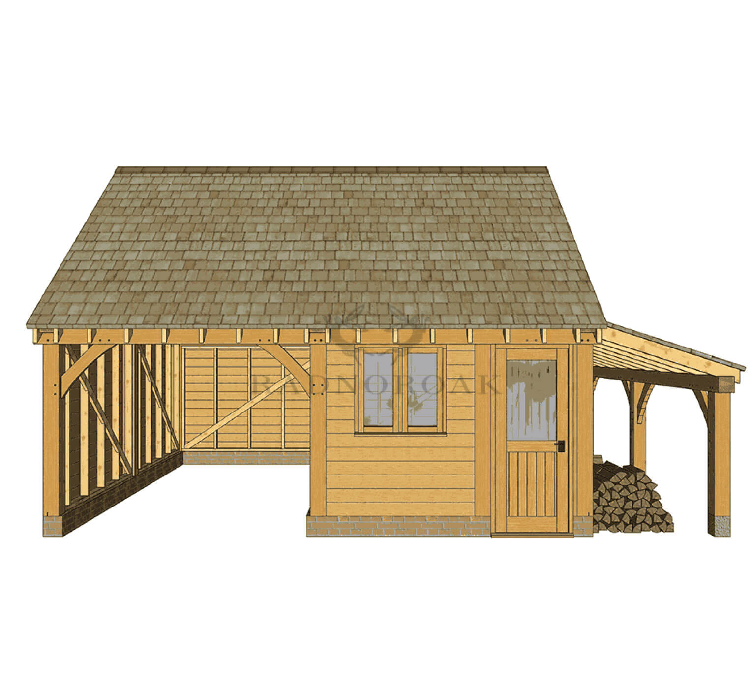 The Byton High Ridge – BYH2011 is a versatile two bay oak-framed building that combines an open-fronted carport, an enclosed workshop, and a practical log store. The log store can be positioned on either the left or right-hand side, allowing the layout to be tailored to your property.