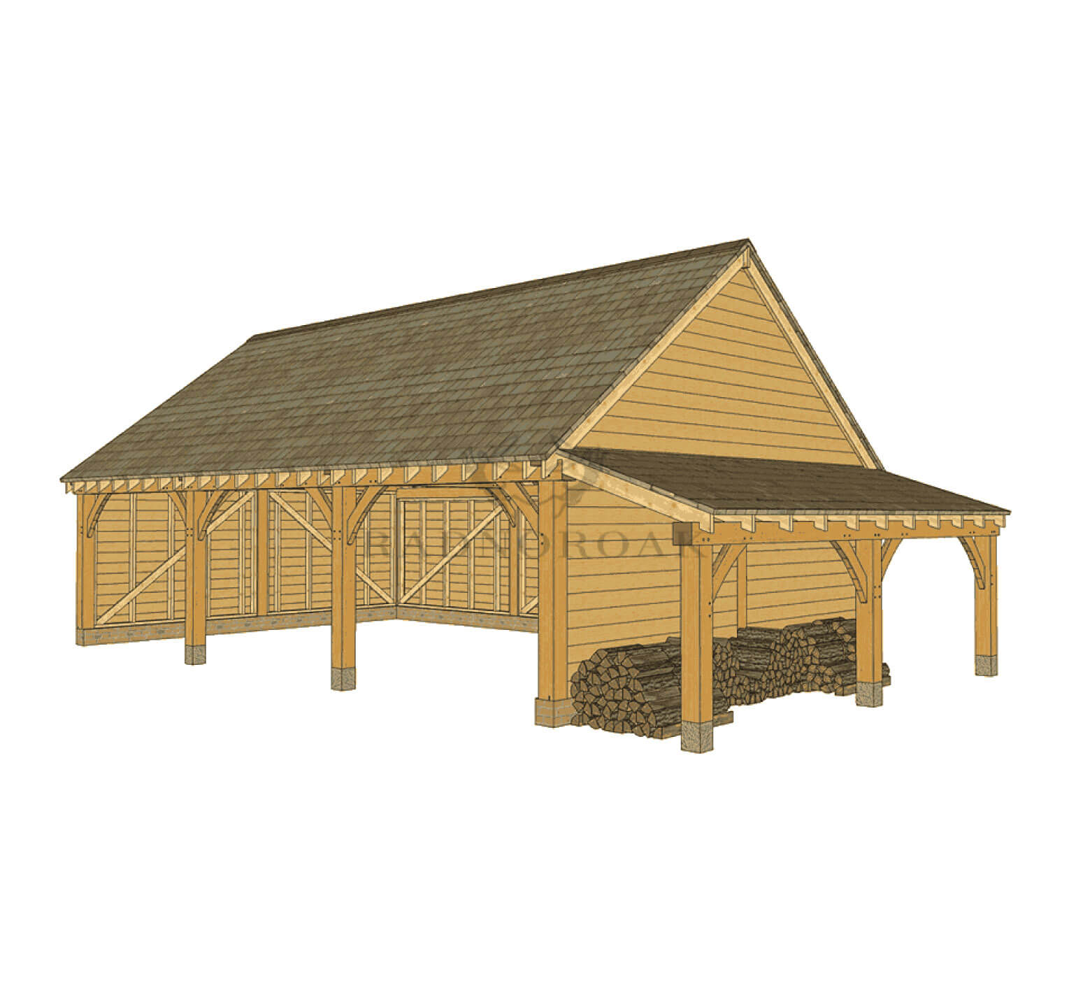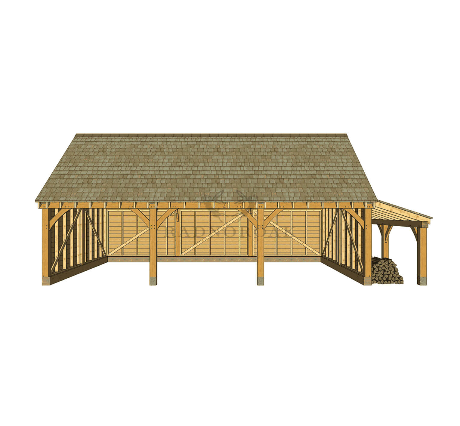 A traditional three bay oak carport with the added benefit of a sheltered log store, ideal for countryside homes, estates, or properties needing generous outdoor storage and dependable long-term performance.
