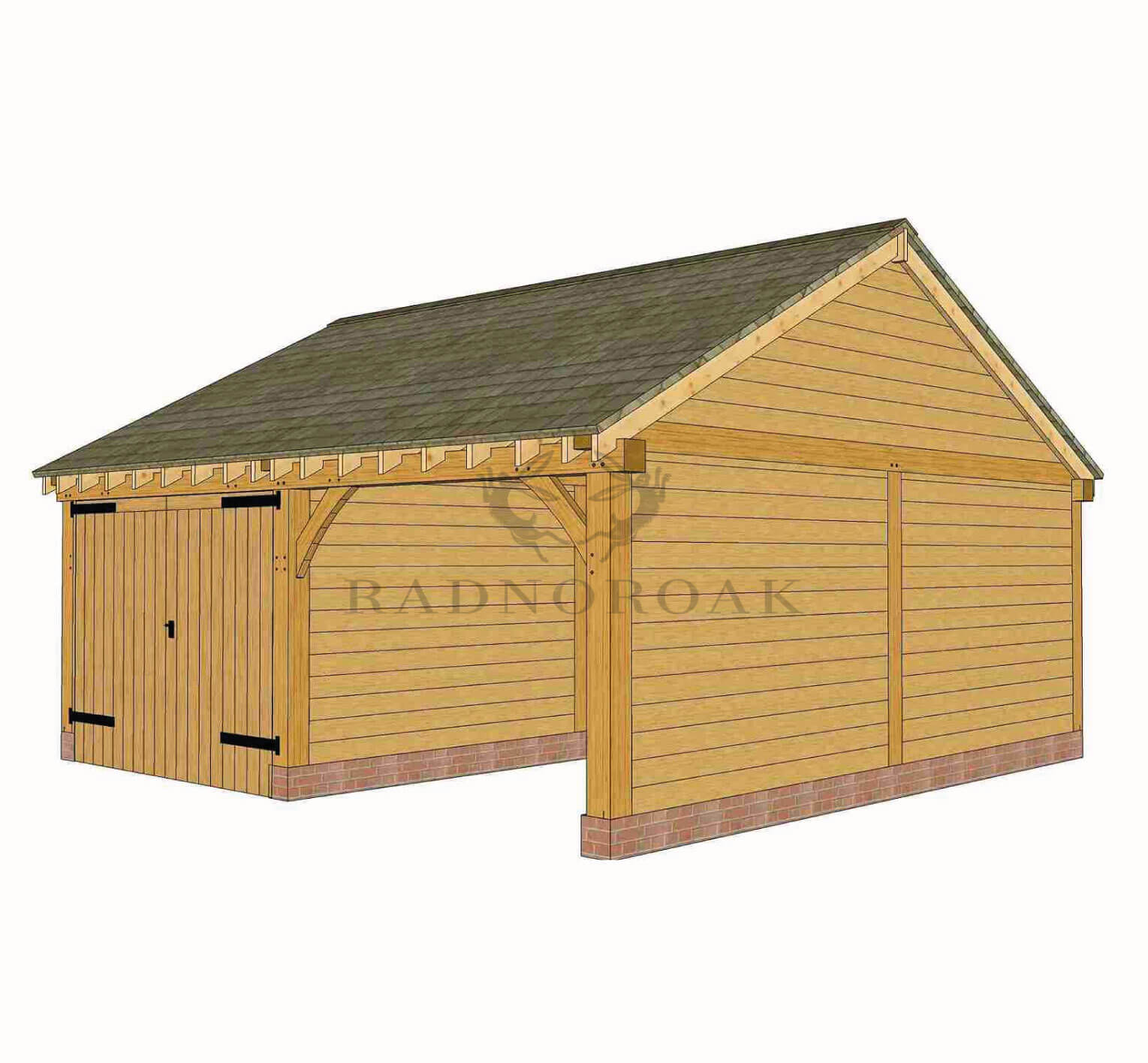 A classic oak garage design combining secure storage, this two bay structure includes one enclosed garage bay with double doors and one open fronted car port.