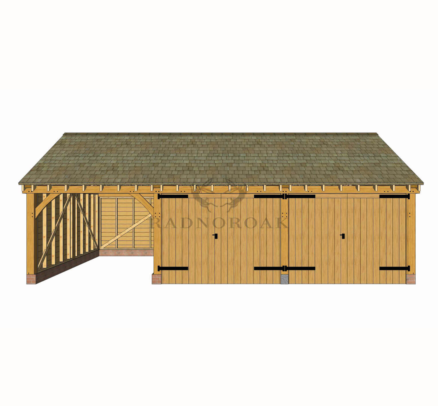 The BYL3004 is a robust three bay oak framed building featuring two enclosed garage bays with solid timber doors and a single open-fronted carport - ideal for secure parking, equipment storage, or workshop use.