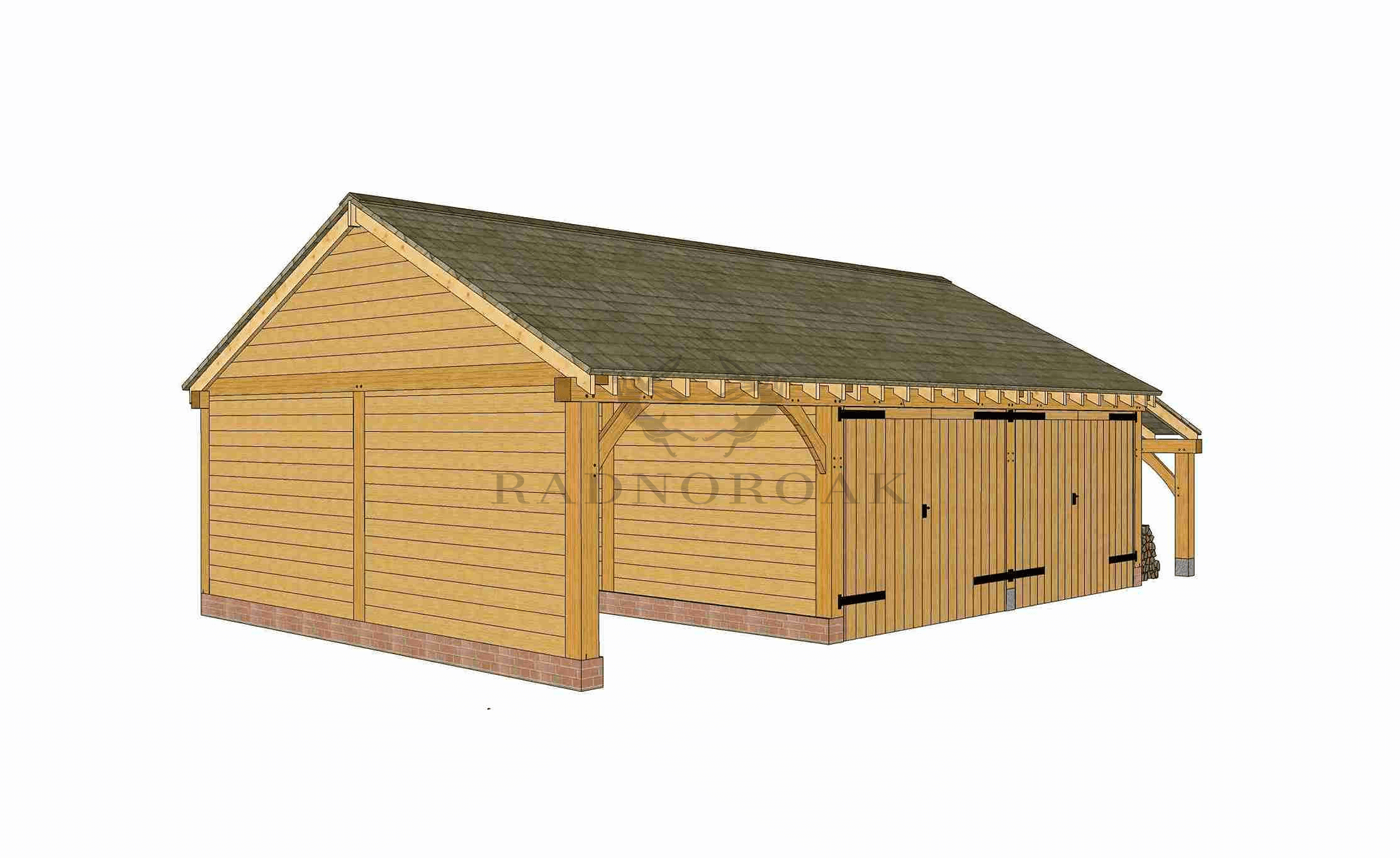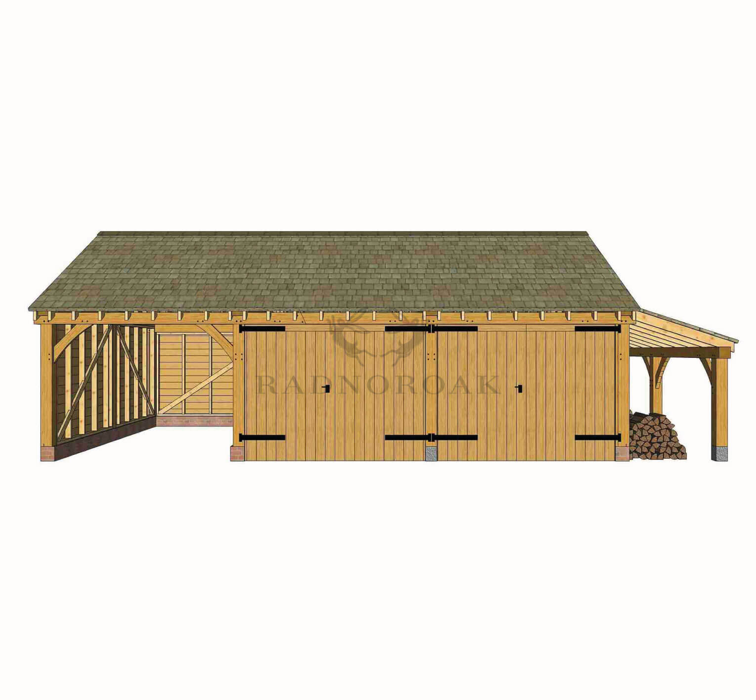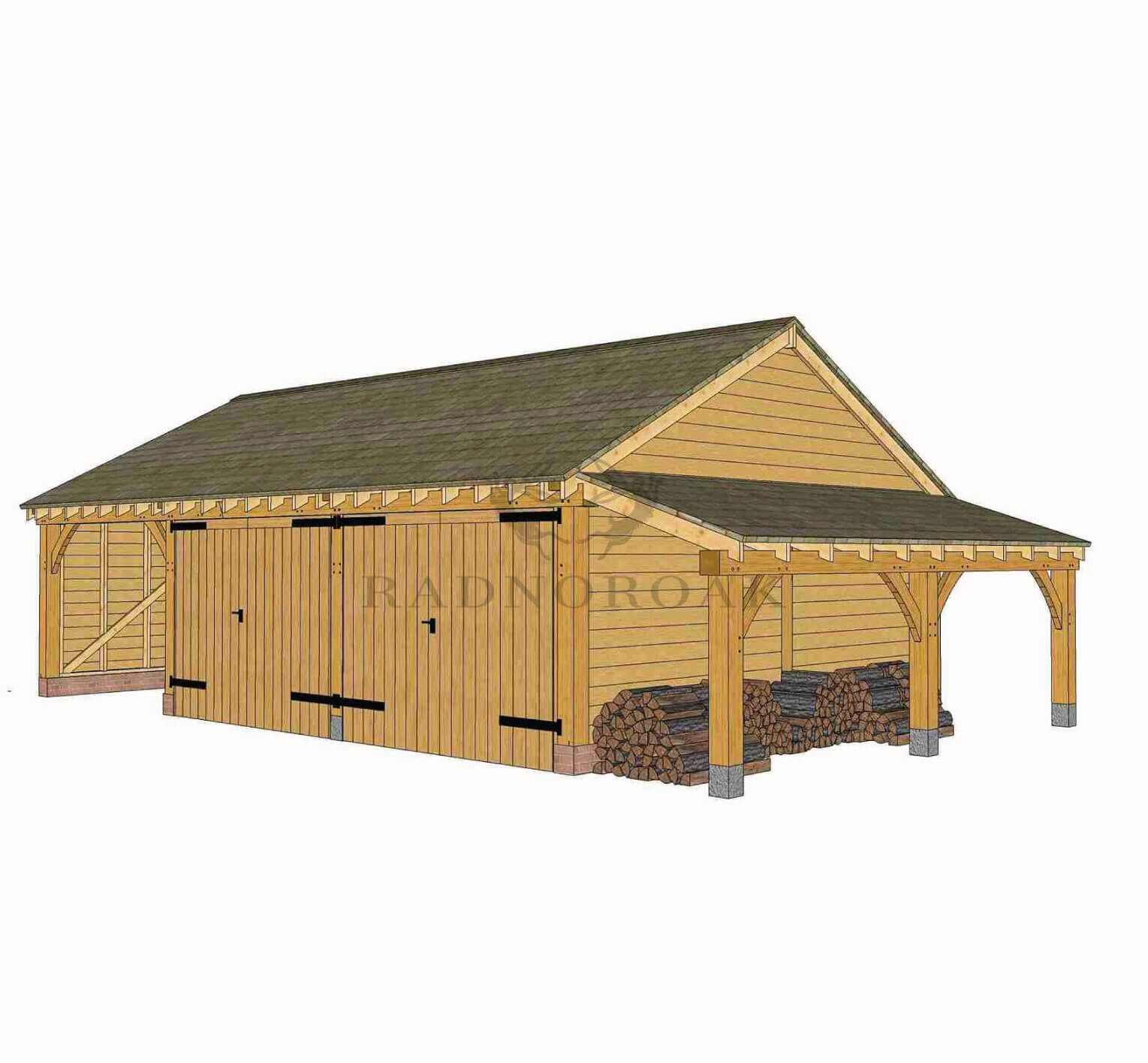 Introducing the Byton 3-Bay Oak Garage with an included Carport and Oak Log Store from Radnor Oak, a UK leader in traditionally jointed oak and timber framed buildings since 1990. This structure boasts a Single Carport & Double Garage, complete with high-quality timber doors. Its finished height, less than 4 metres, might exempt it from requiring planning permission. However, this depends on the roofing materials and brickwork used.