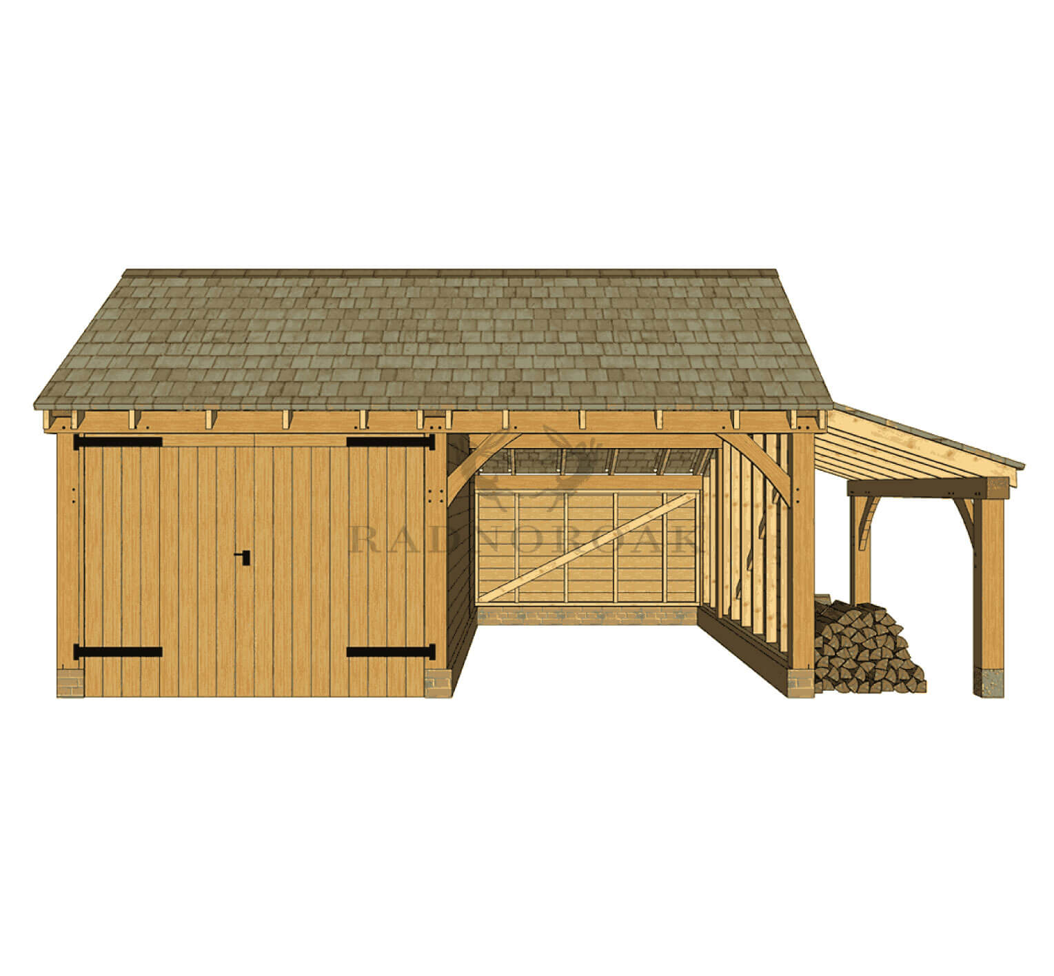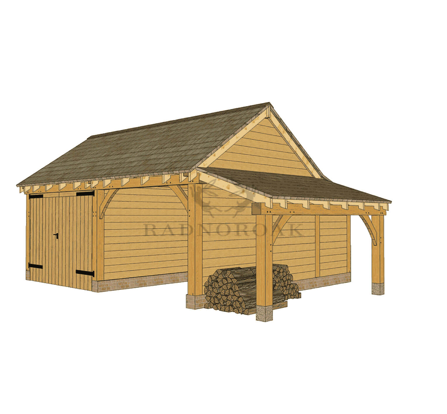 The Two Bay Oak Framed Garage with Carport & Log Store – KI2017 is a versatile oak-framed building with a catslide roof. It combines one enclosed garage bay with solid timber doors, one open-fronted carport for convenient everyday parking, and a covered oak log store on the right-hand side for ventilated firewood storage.