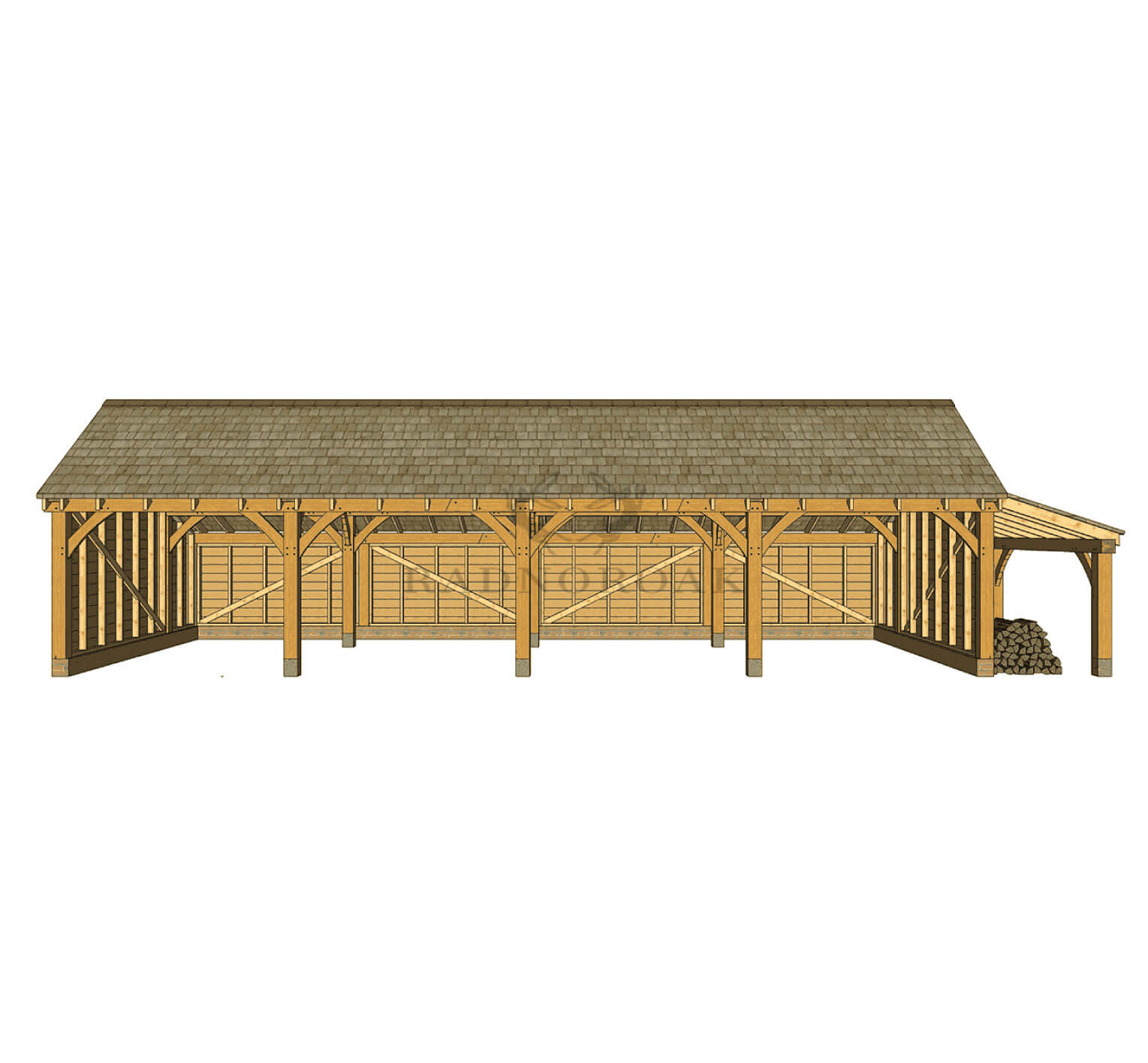 The Four Bay Oak Framed Carport with Log Store – KI4002 is a spacious oak-framed building designed to provide open vehicle shelter alongside practical log storage. It features four open-fronted bays for multiple vehicles and an integrated log store positioned on the right-hand side, offering tidy and ventilated storage for firewood or garden equipment.