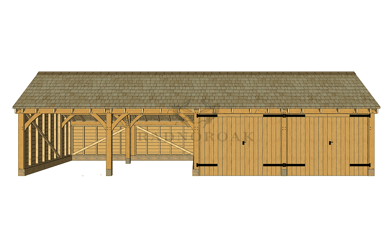 This 4 bay oak framed outbuilding combines two open-fronted carports with a secure double garage – ideal for countryside homes with multiple vehicles or storage needs. Crafted using traditional mortice and tenon joints and premium-grade oak, the structure showcases Radnor Oak’s signature chunky posts, featheredge cladding, and barn-style joinery. Measuring 12.00m wide with an entrance height of 2.1m, it sits under 4 metres tall – meaning it may not require planning permission. The final height depends on your choice of roofing and brickwork. Built in our Mid-Wales workshop, this classic oak framed garage delivers everyday practicality with timeless appeal.