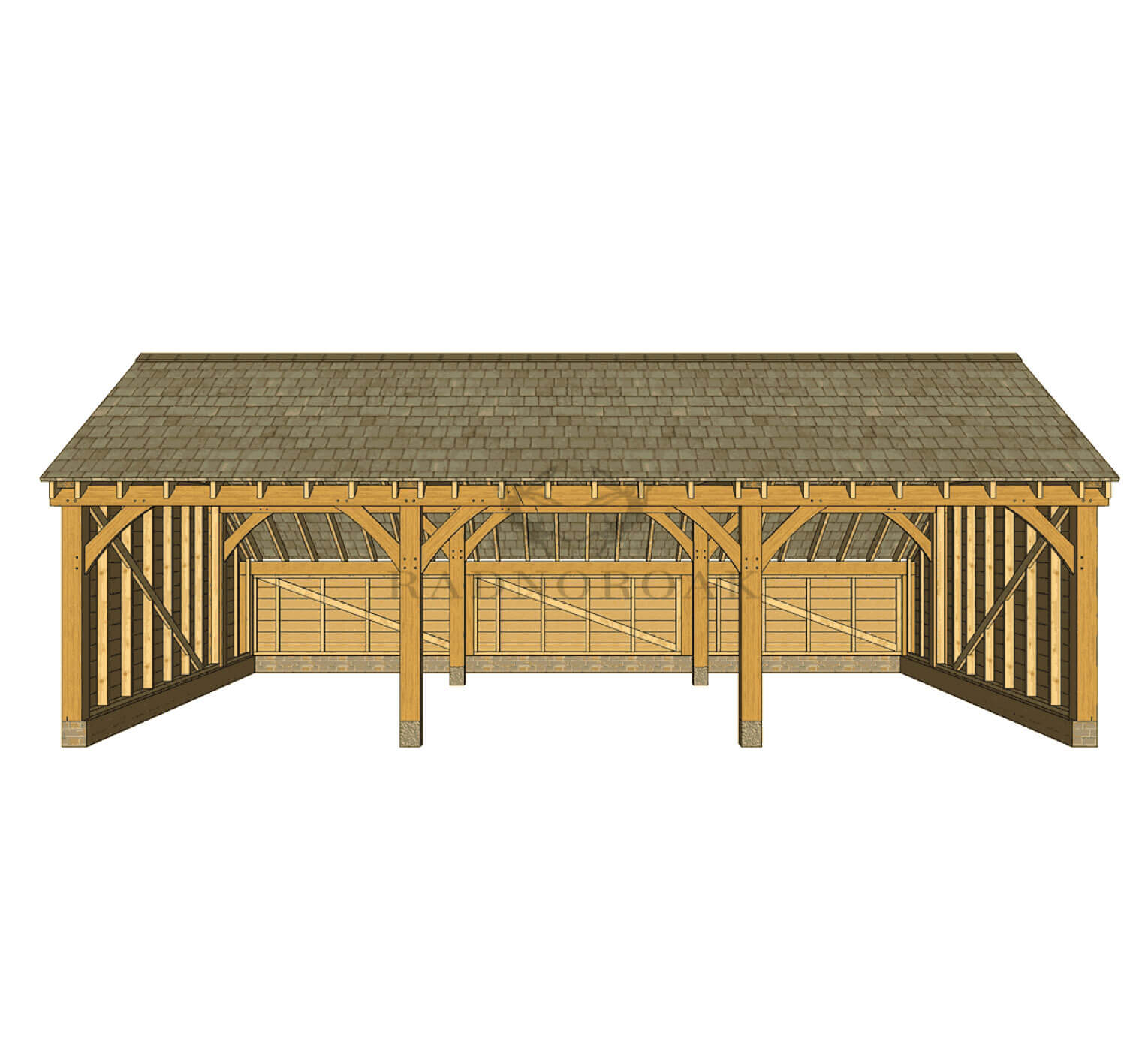 Constructed in our Mid-Wales workshop using premium oak and time-honoured mortice and tenon joints, this oak carport includes our signature chunky oak posts, traditional knee braces, and traditional gable roof. At 9.00m wide and 3.77m high, it provides generous space for multiple vehicles, with ample room for storage or workshop use if desired.