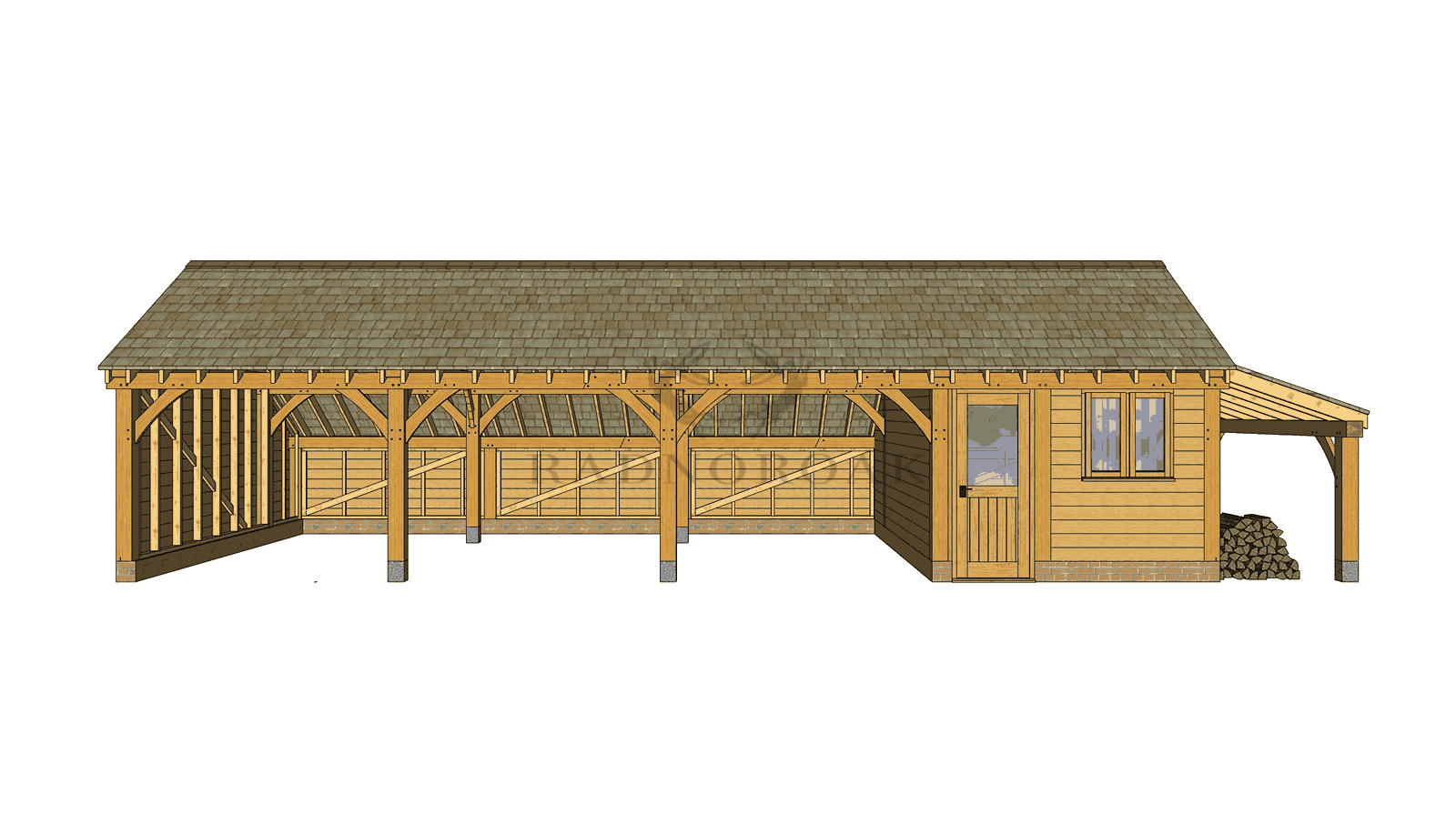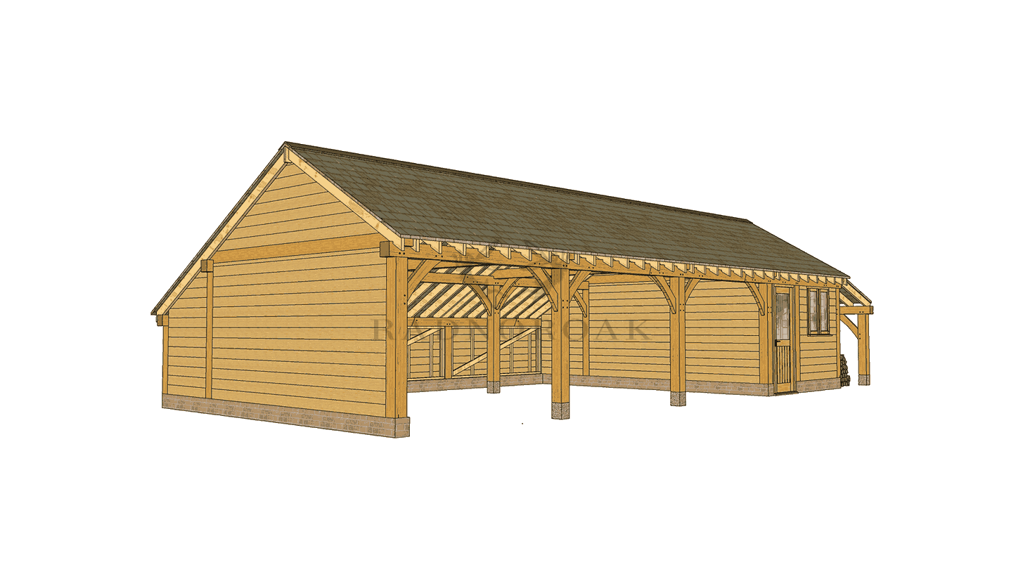 The Lucton LUC4008 is a large and versatile 4-bay oak framed garage, featuring a triple open carport, a single enclosed workshop, and an optional log store to the left or right. This multi-use layout offers secure storage, all-weather parking, and space to work, perfect for busy households or hobbyists.
