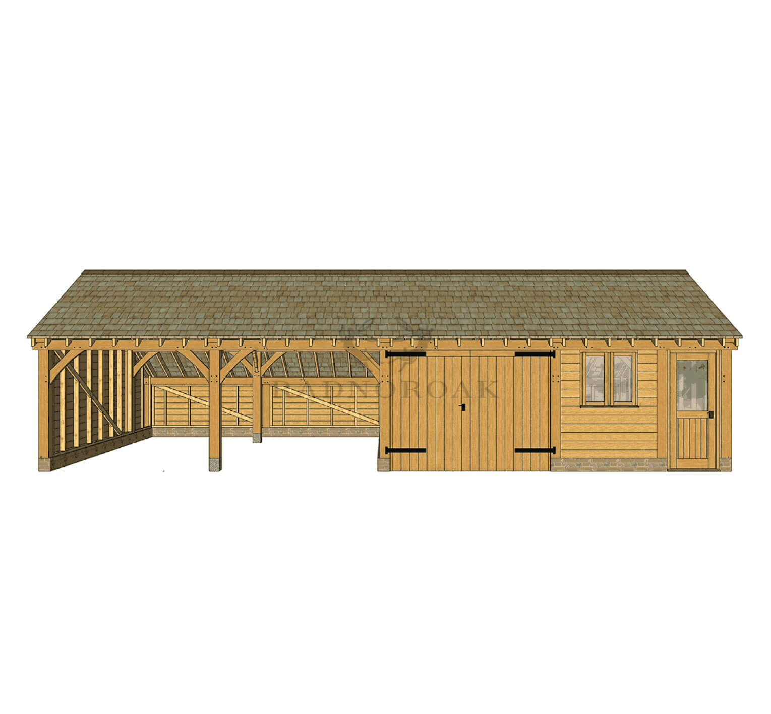 This four bay oak framed outbuilding balances practicality with refined countryside character. Featuring a double open carport, an enclosed oak garage, and a spacious workshop, it provides flexible storage for vehicles, tools, or hobby equipment - with an optional log store available on either side.
