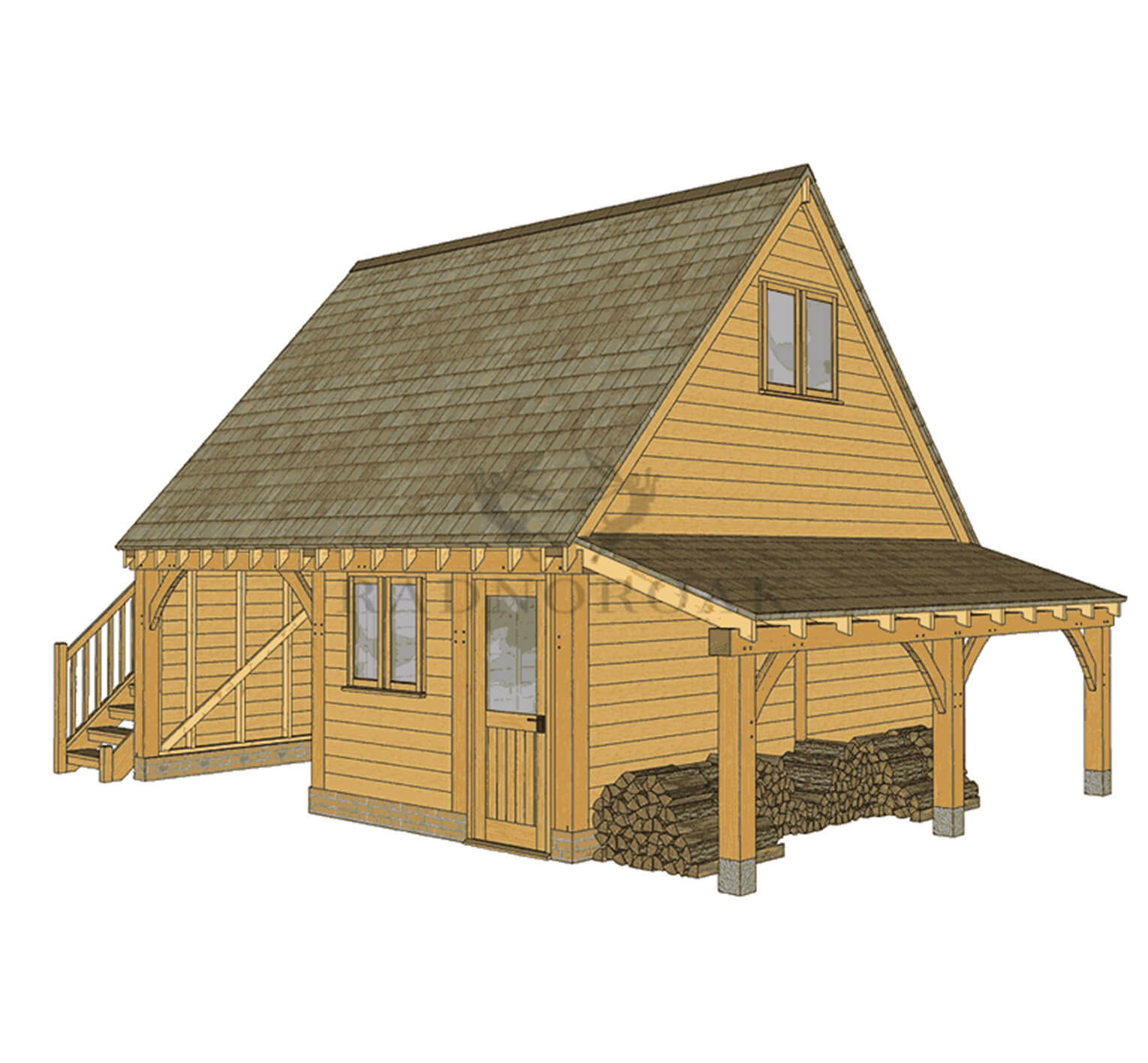 This beautifully balanced lofted two bay oak framed garage blends practical ground-floor storage with a spacious upper room and covered log store - a beautiful and practical addition to your home.