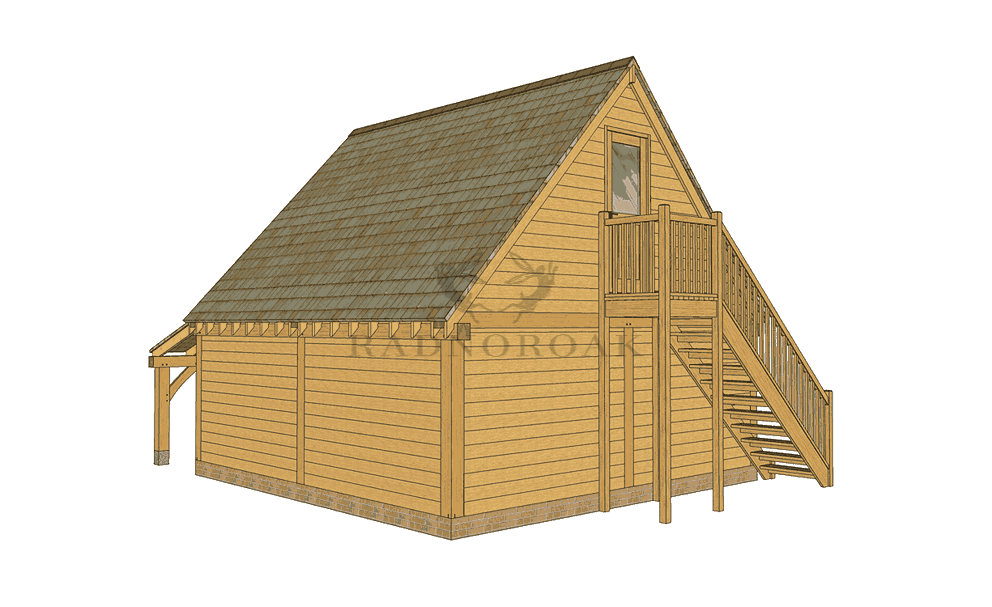 An external oak staircase leads to a spacious upper room, ideal for use as a home office, guest accommodation, hobby studio, or creative space. The steep 47° pitched roof allows for excellent headroom and the option of rooflights or dormer windows to bring in natural light.