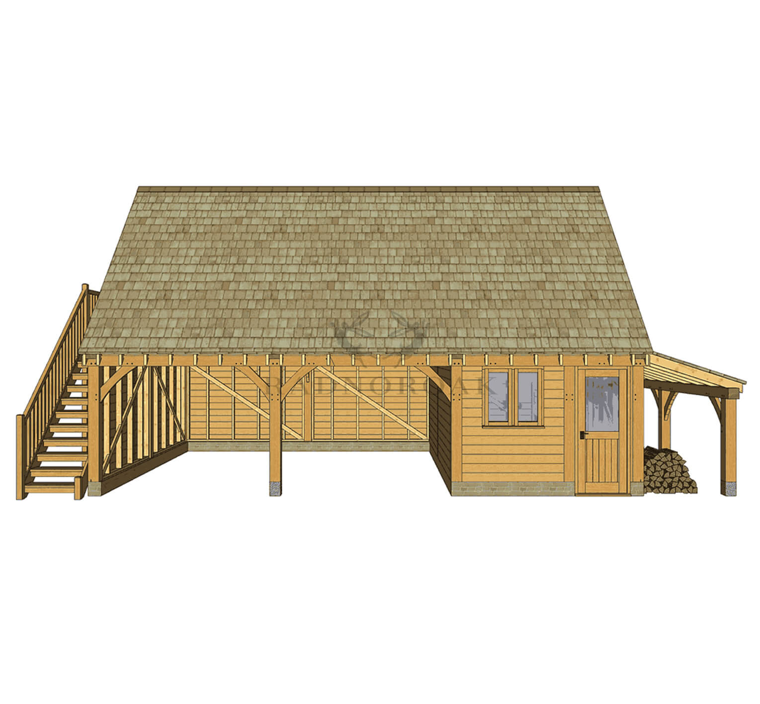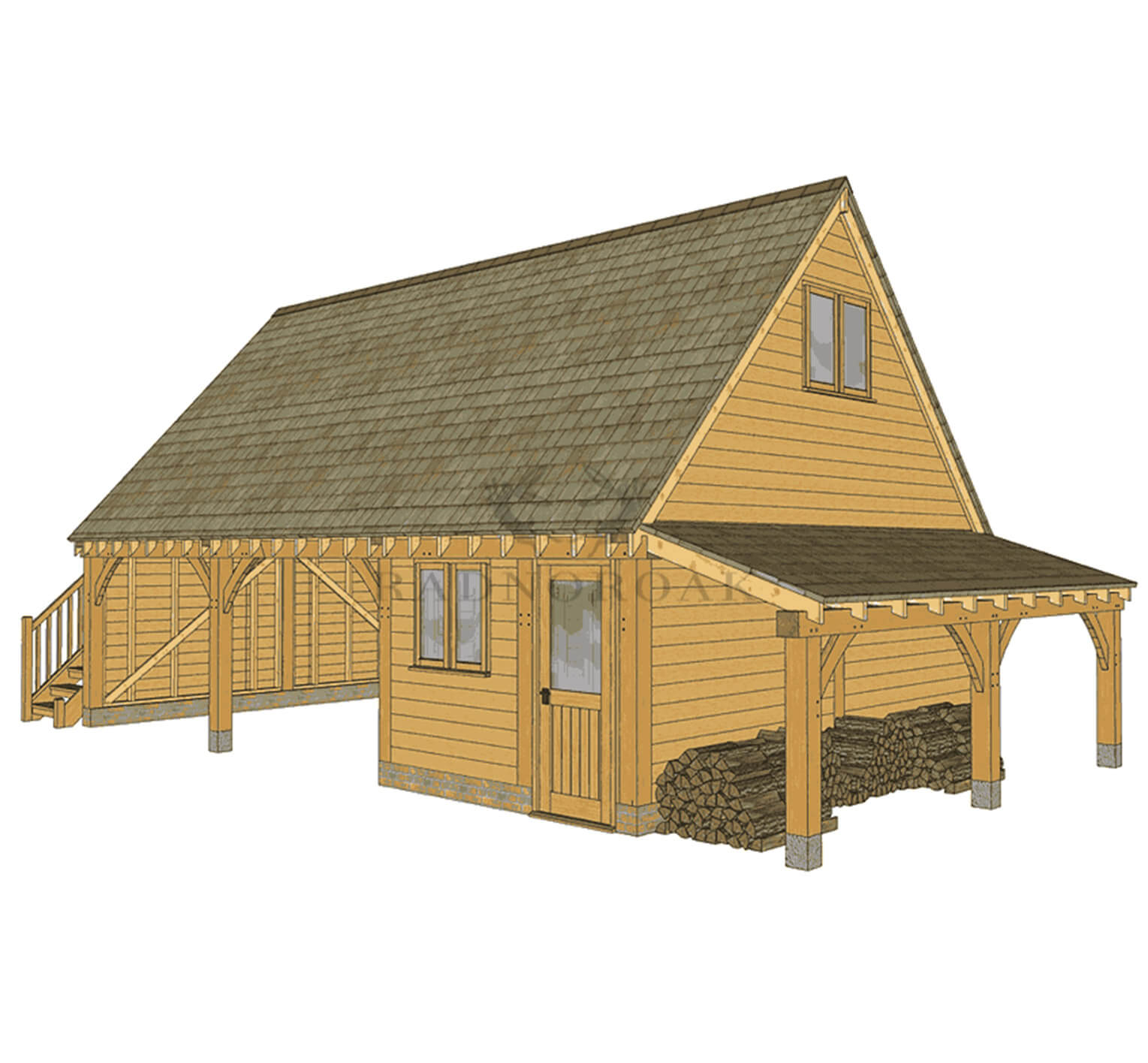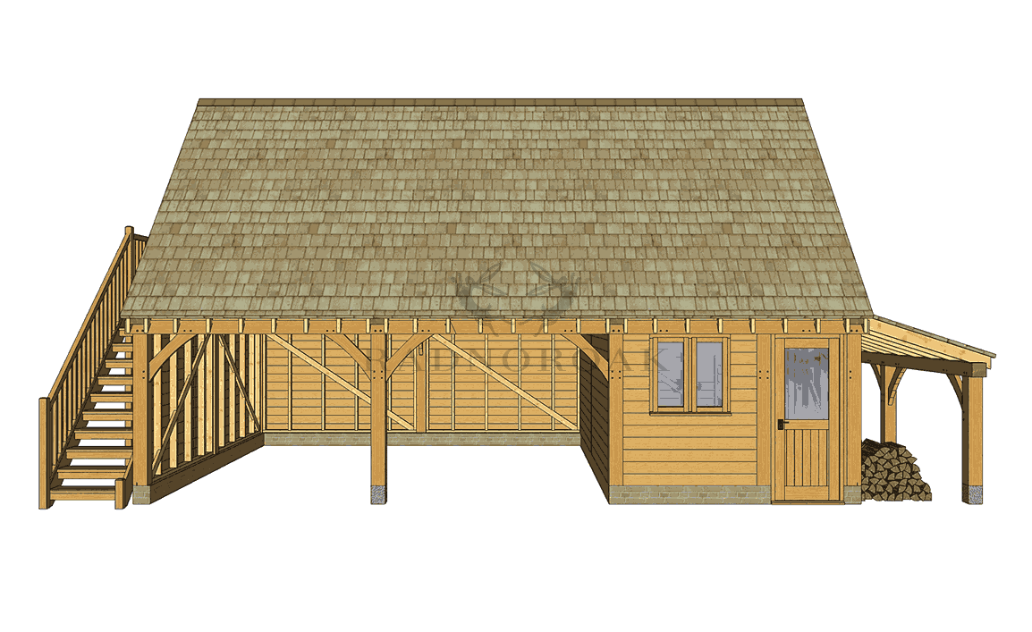 This structure features two open carport bays and one enclosed bay with traditional timber doors. The upper room, accessed by an external oak staircase, can be configured for a wide range of uses. The log store can be placed on either side to suit your site layout.