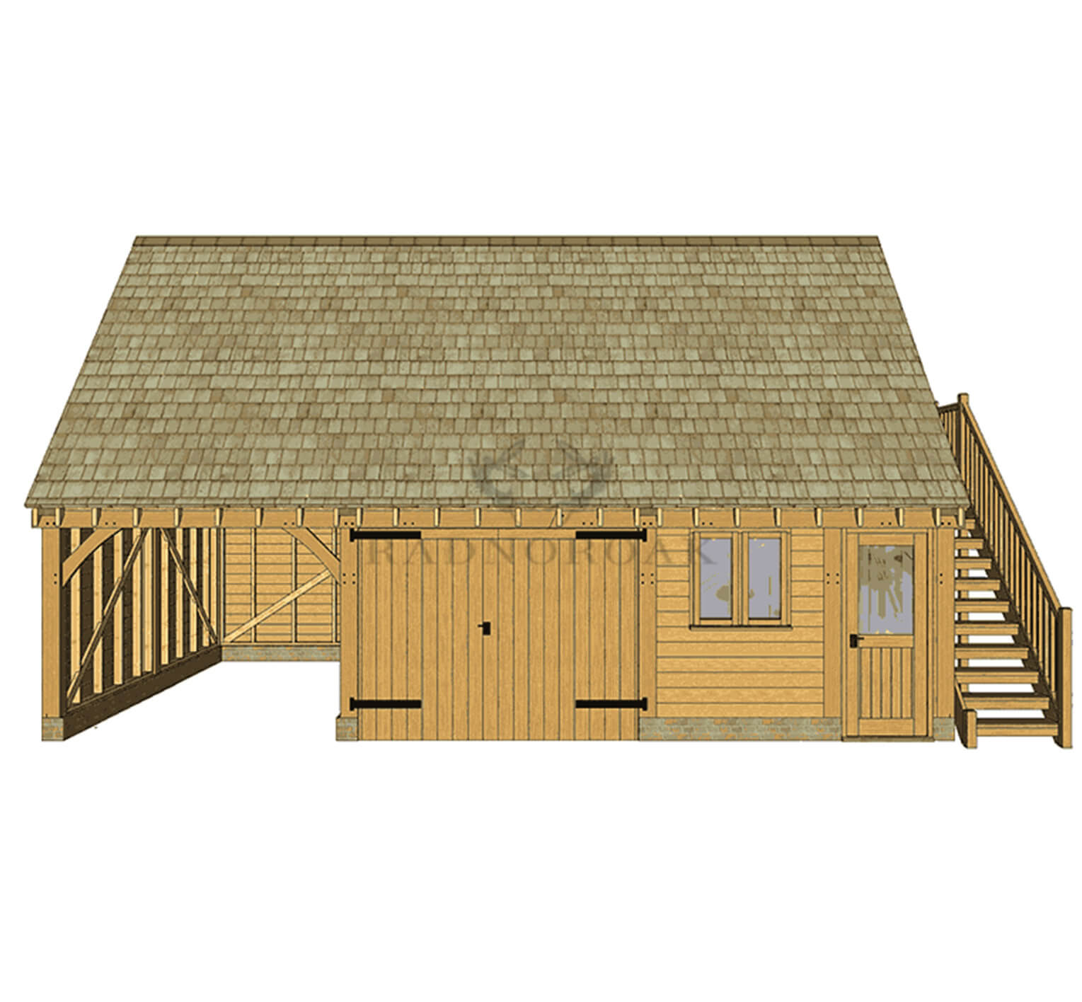 The layout features an open fronted bay for daily parking and one enclosed garage bay with double doors, ideal as a workshop or secure storage area. To the right, a glazed personnel door and window offer practical access and natural light.The external staircase, which can be positioned to either side, leads to a spacious lofted room – perfect for use as a home office, games room, annexe or guest accommodation.