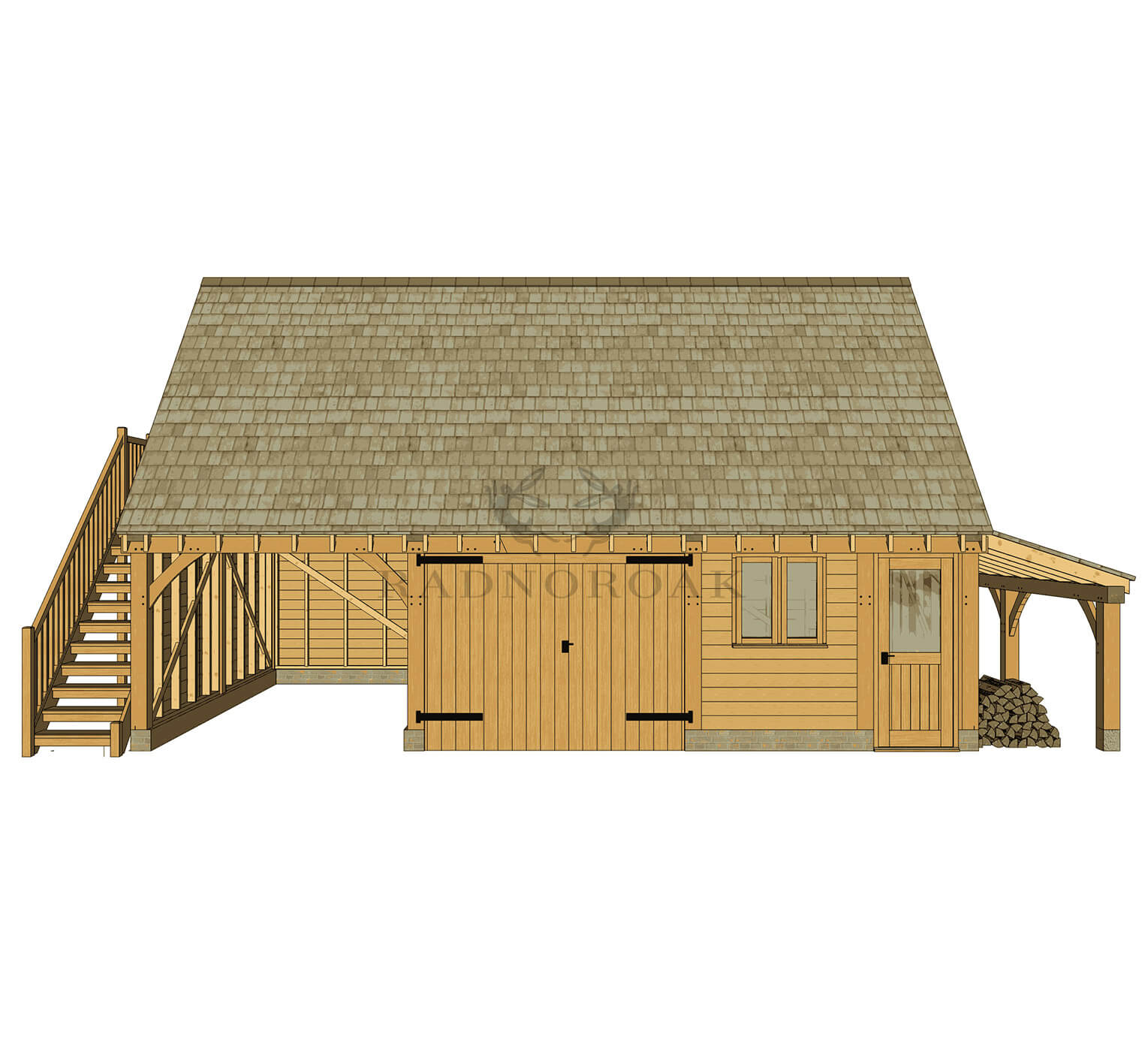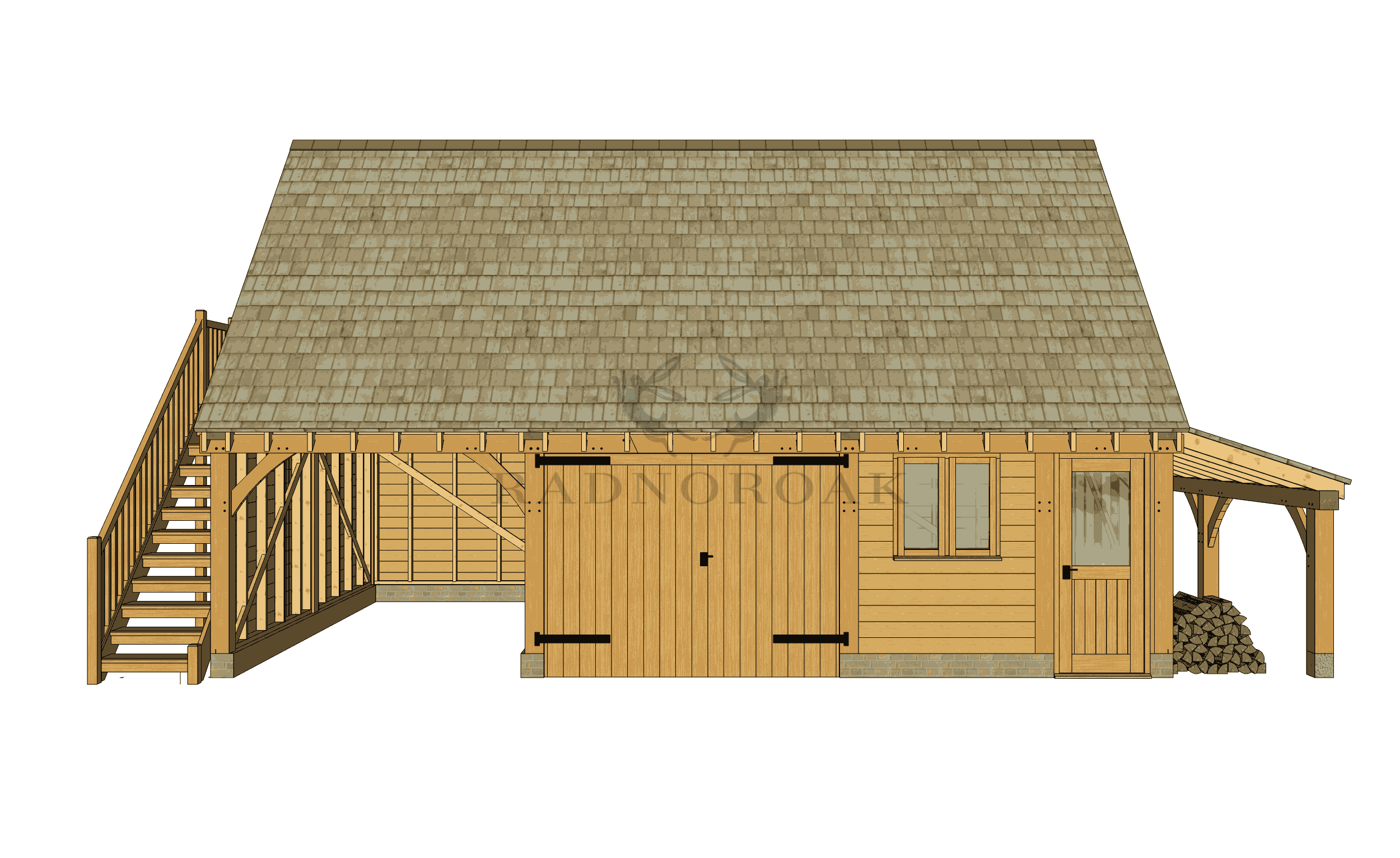 An external staircase leads to a spacious upper room with a gable-end window and a 47-degree roof pitch - perfect as a home office, guest room, hobby space or games room. To the right, a covered oak log store adds practical outdoor storage while complementing the building’s rural aesthetic. The layout of both the staircase and log store can be mirrored to suit your site.