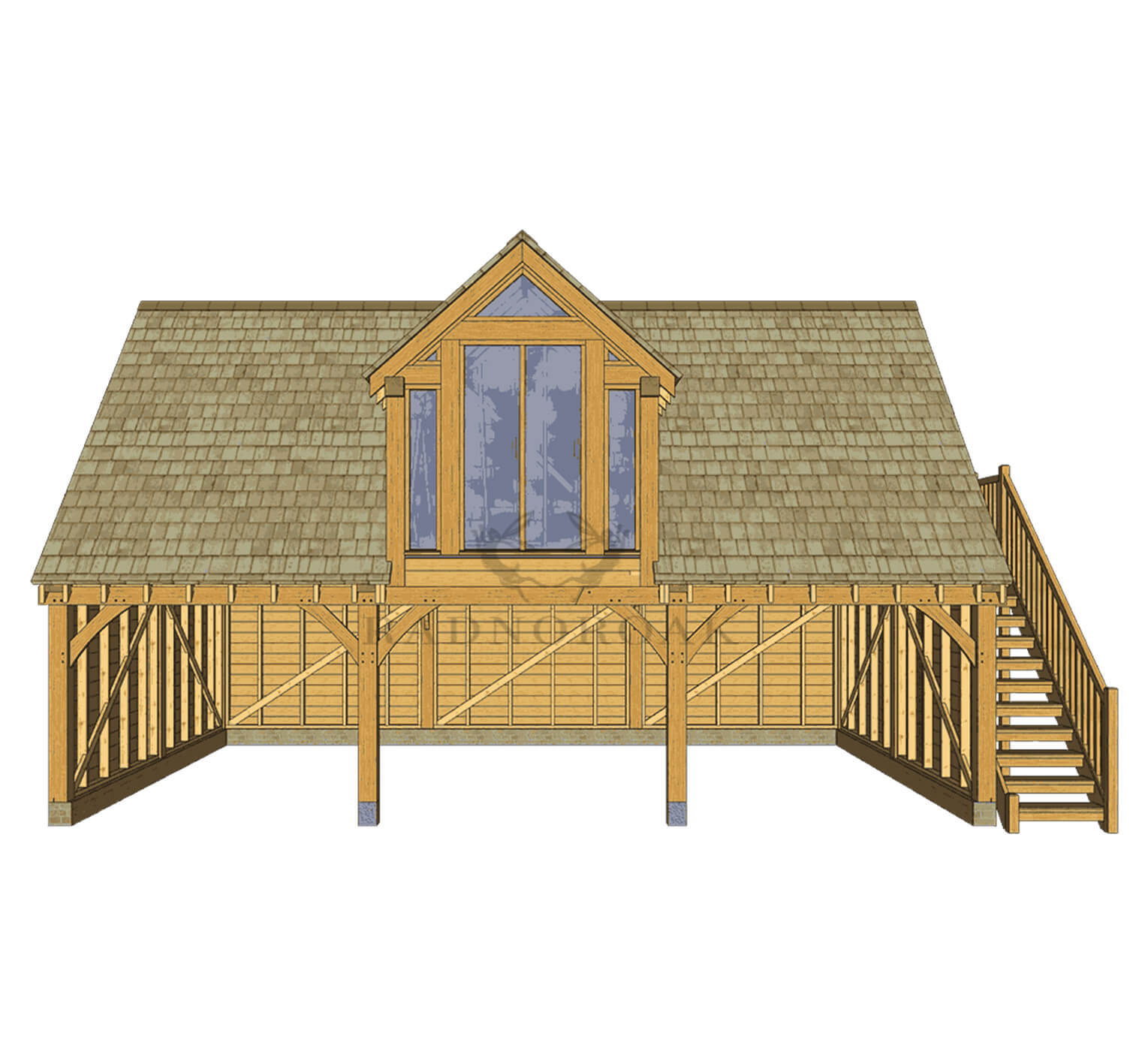 Crafted with traditional mortice and tenon joints, the structure features robust oak posts, featheredge cladding, and an external oak staircase for convenient access to the upper level. The full-width dormer adds natural light, increased headroom, and architectural character to the design.
