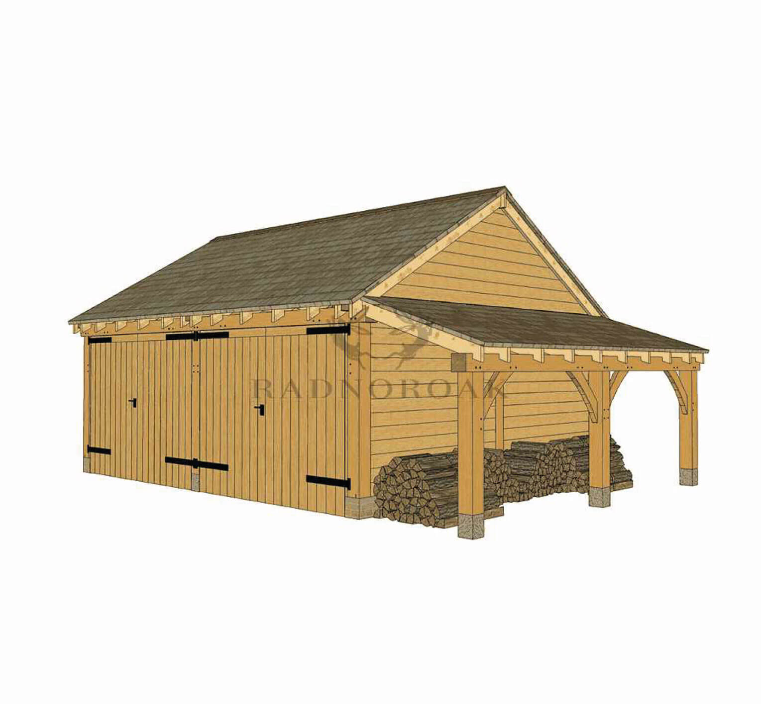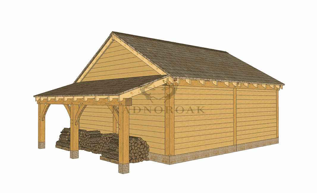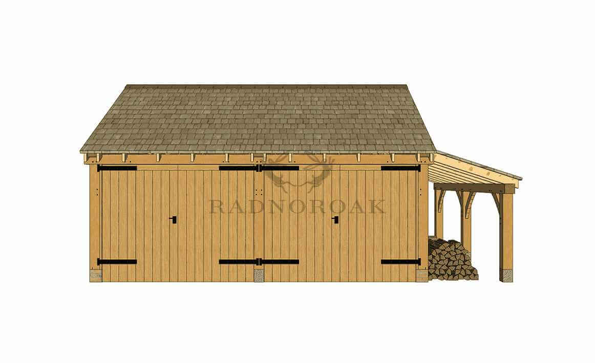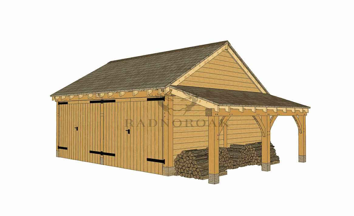 Handcrafted in our Mid-Wales workshop using premium oak and traditional mortice and tenon joints, the design features chunky oak posts, solid timber garage doors, and premium featheredge cladding. The log store, positioned to the right, provides sheltered space for firewood or garden supplies and can be configured to suit your site.